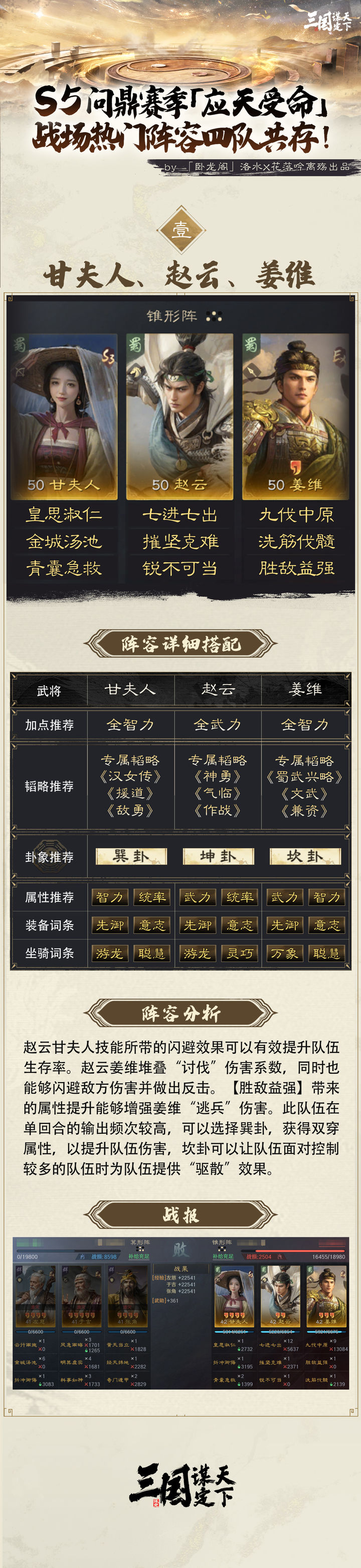 本期【卧龙阁】洛水X花落吟离殇为大家带来“S5问鼎赛季战场热门阵容四队共存推荐”,每套阵容都附有韬略推荐、加点建议、阵容分析以及卦象推荐。让我们一起看看,当前战场的热门共存阵容都有哪些吧!