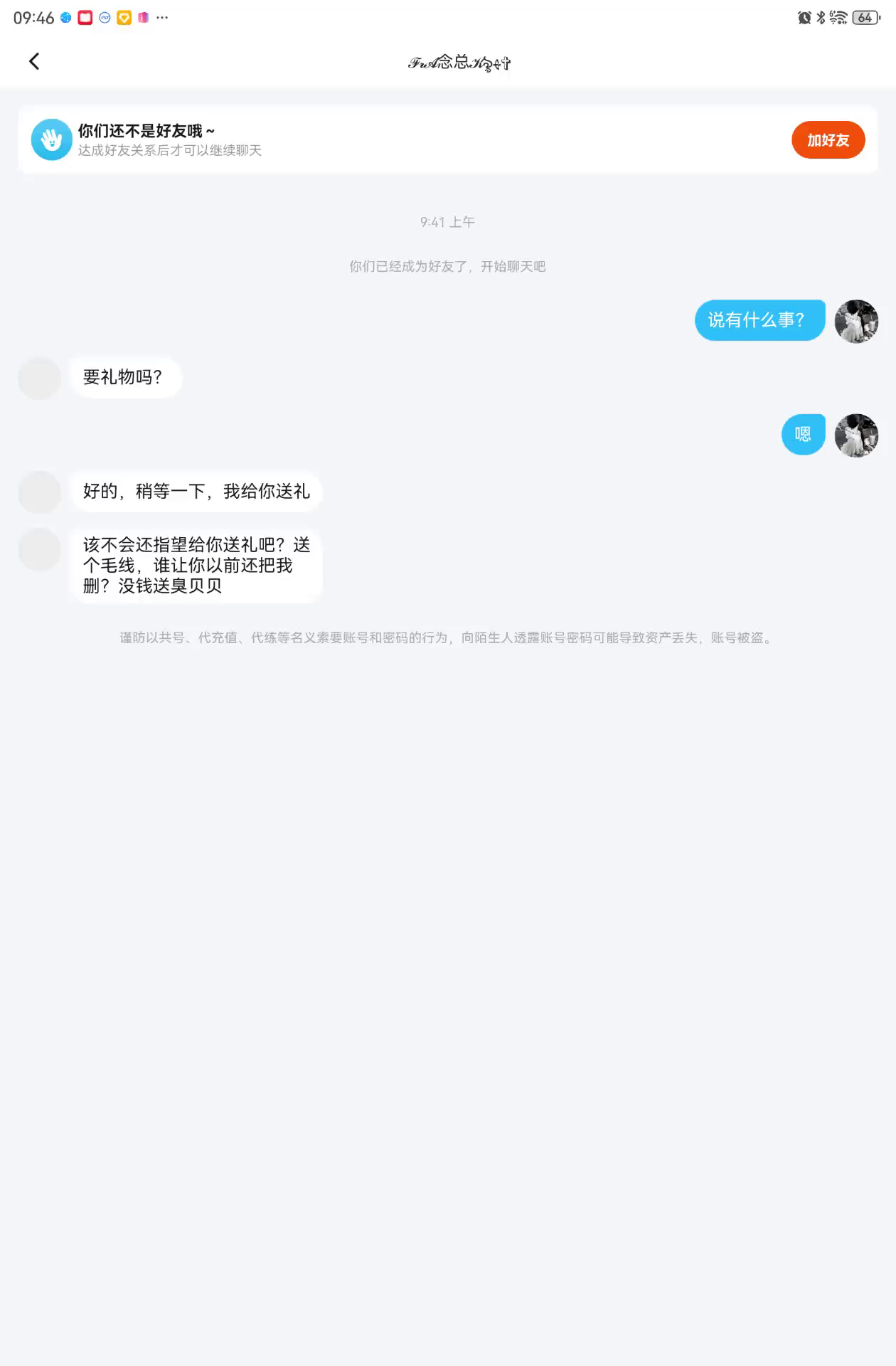请看左上方。看见他还有官方的好友的人帮我,你等一下帮我封号一下。谢谢了