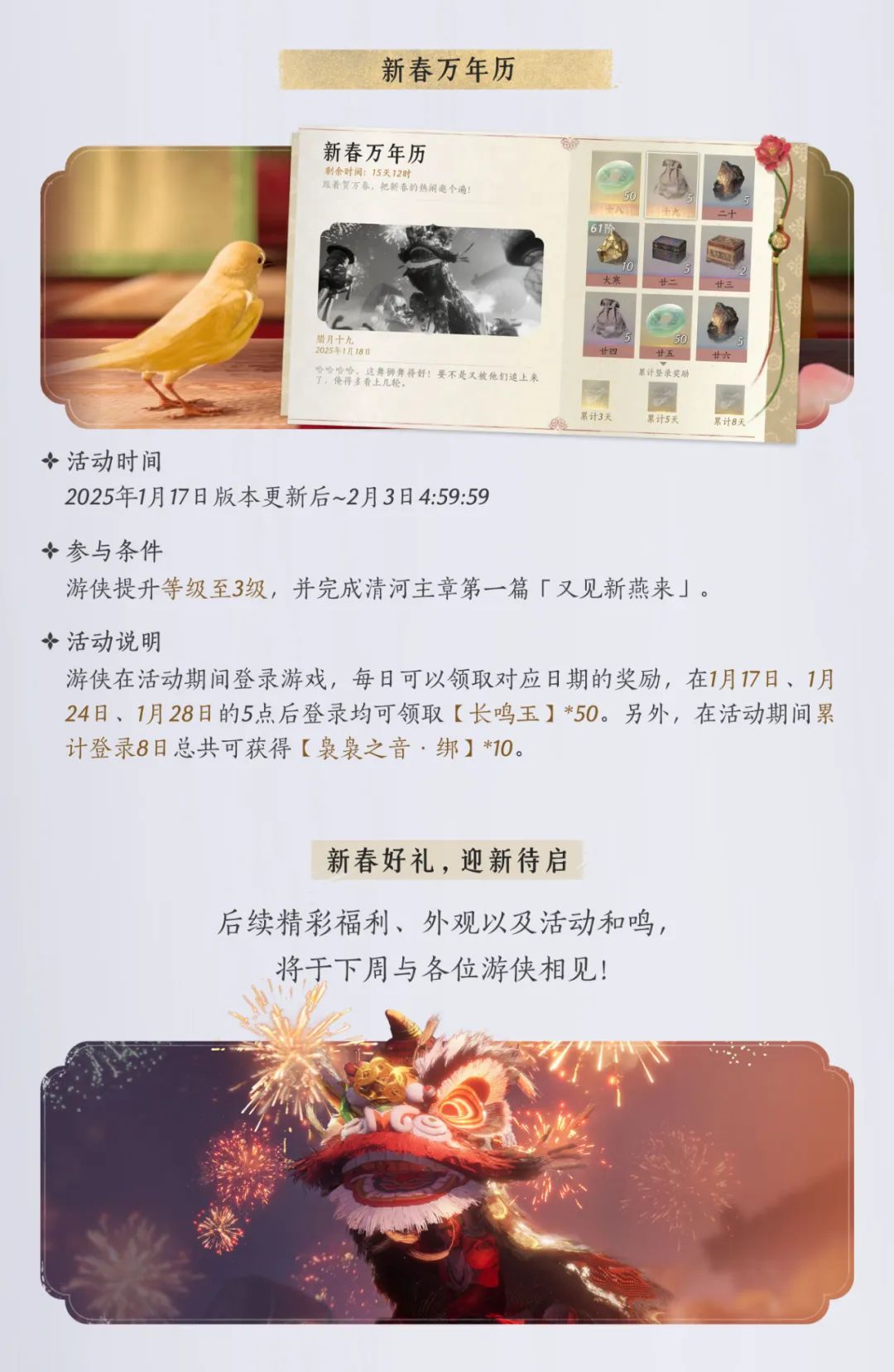 万侠同庆,江湖同乐,诸多新春活动陆续开启,本周版本更新一览也新鲜送达。