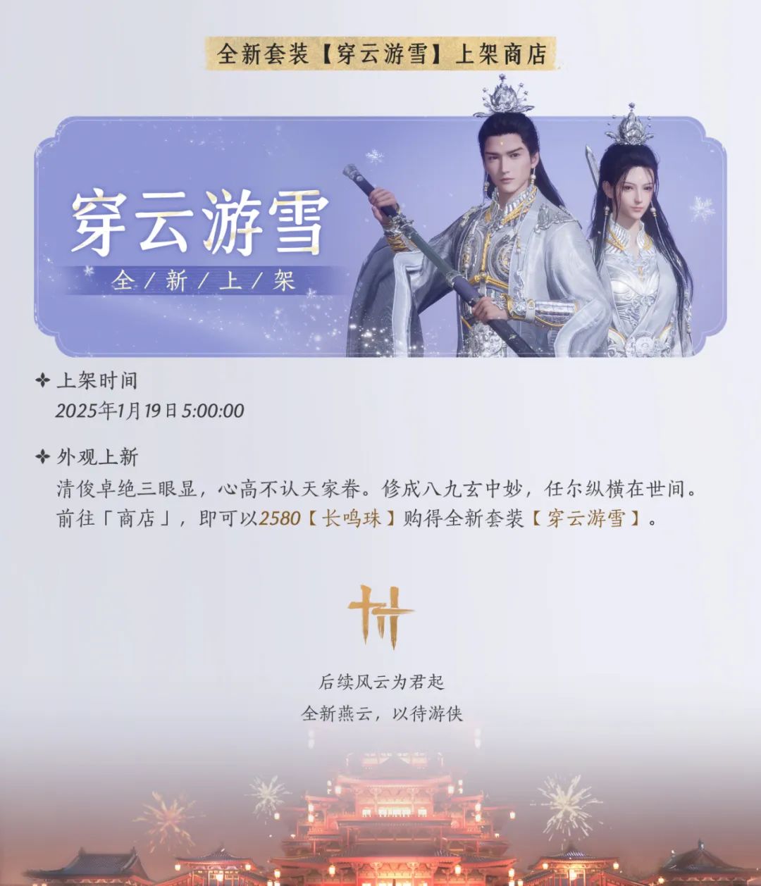 全新外观【穿云游雪】清冷白袍不染纤尘,也藏不住银白鳞甲的英武之气。
