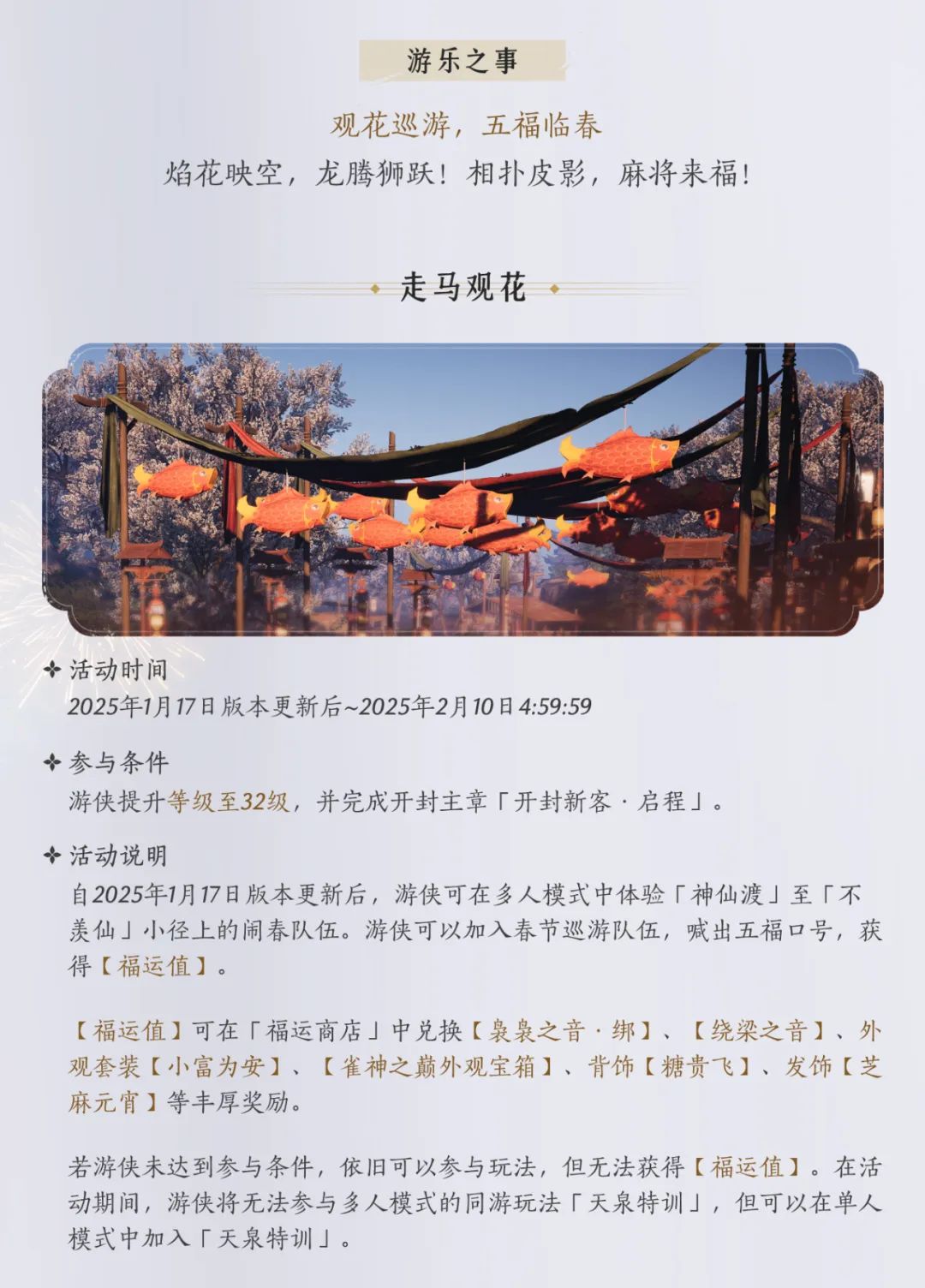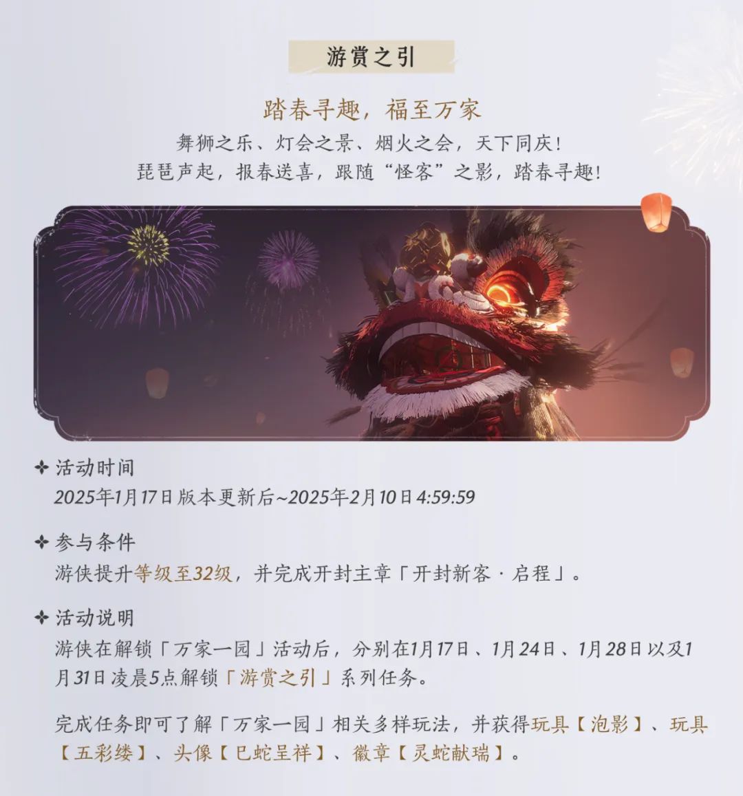 诚邀游侠们一起加入游园闹春的队伍,仗剑分享欢喜,共赴江湖大同——