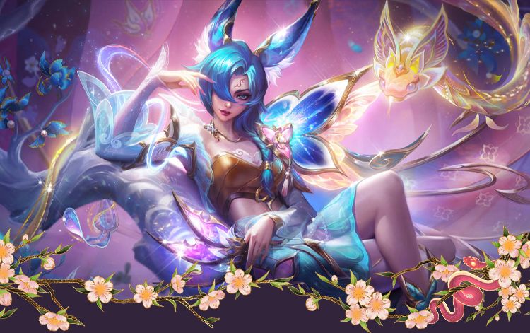 霞四周被金色蝴蝶围绕,翅膀由粉色幻化为蓝色,向敌方攻击时,蝴蝶会随匕首一同撞向敌方,暂时获得攻速提升并造成额外伤害。击中敌方英雄后还能提供移速加成,身后带有蓝色拖尾特效。