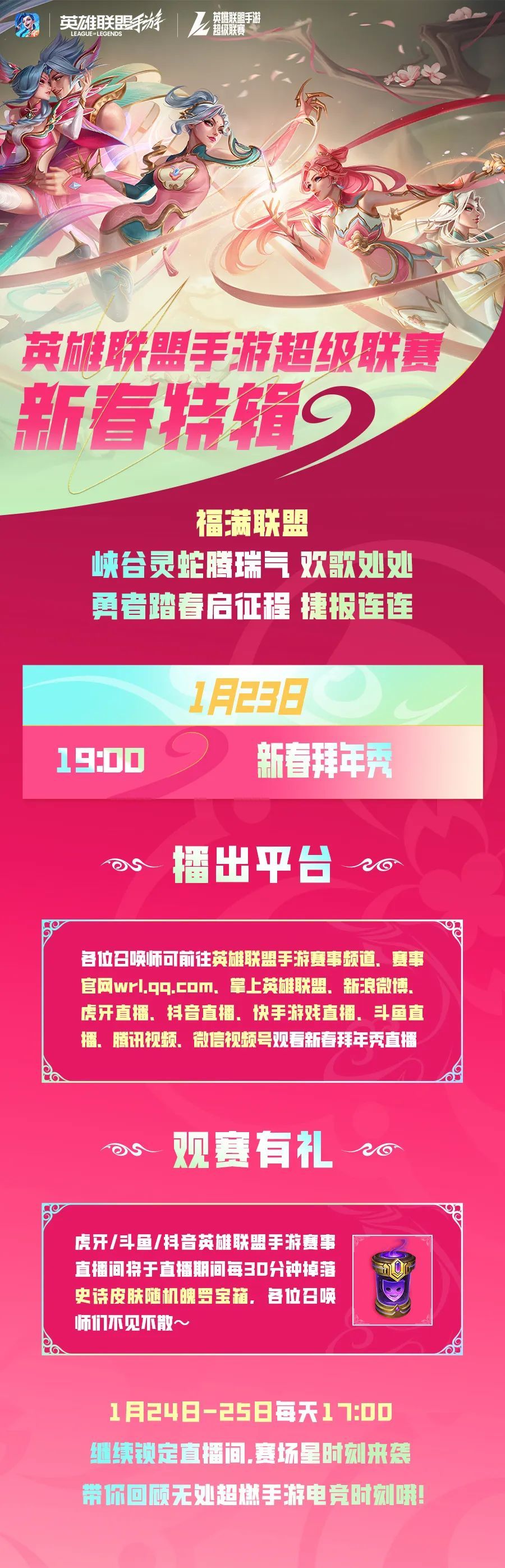 各位召唤师可前往《英雄联盟手游》赛事频道、赛事官网wrl.qq.com、掌上英雄联盟、新浪微博、虎牙直播、抖音直播、快手游戏直播、斗鱼直播、腾讯视频、微信视频号观看新春拜年秀直播,惊喜好礼掉落等你来领~