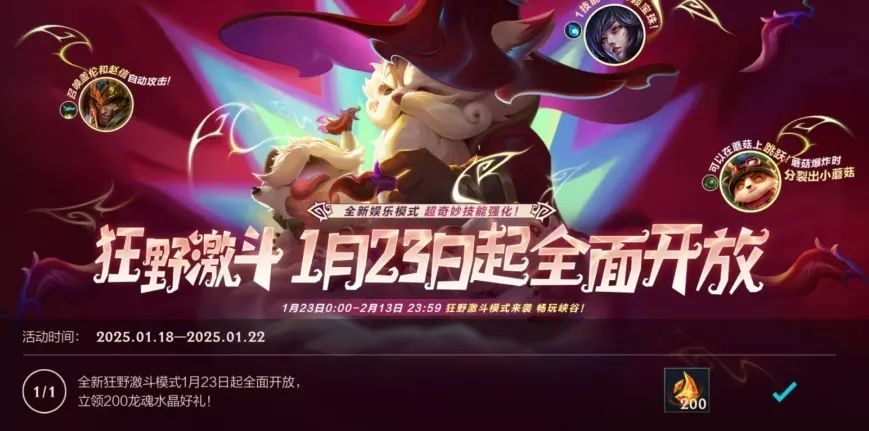 在期待全新模式到来之前,截止至1月22日(今日),召唤师登录游戏即可轻松领取龙魂水晶*200好礼~