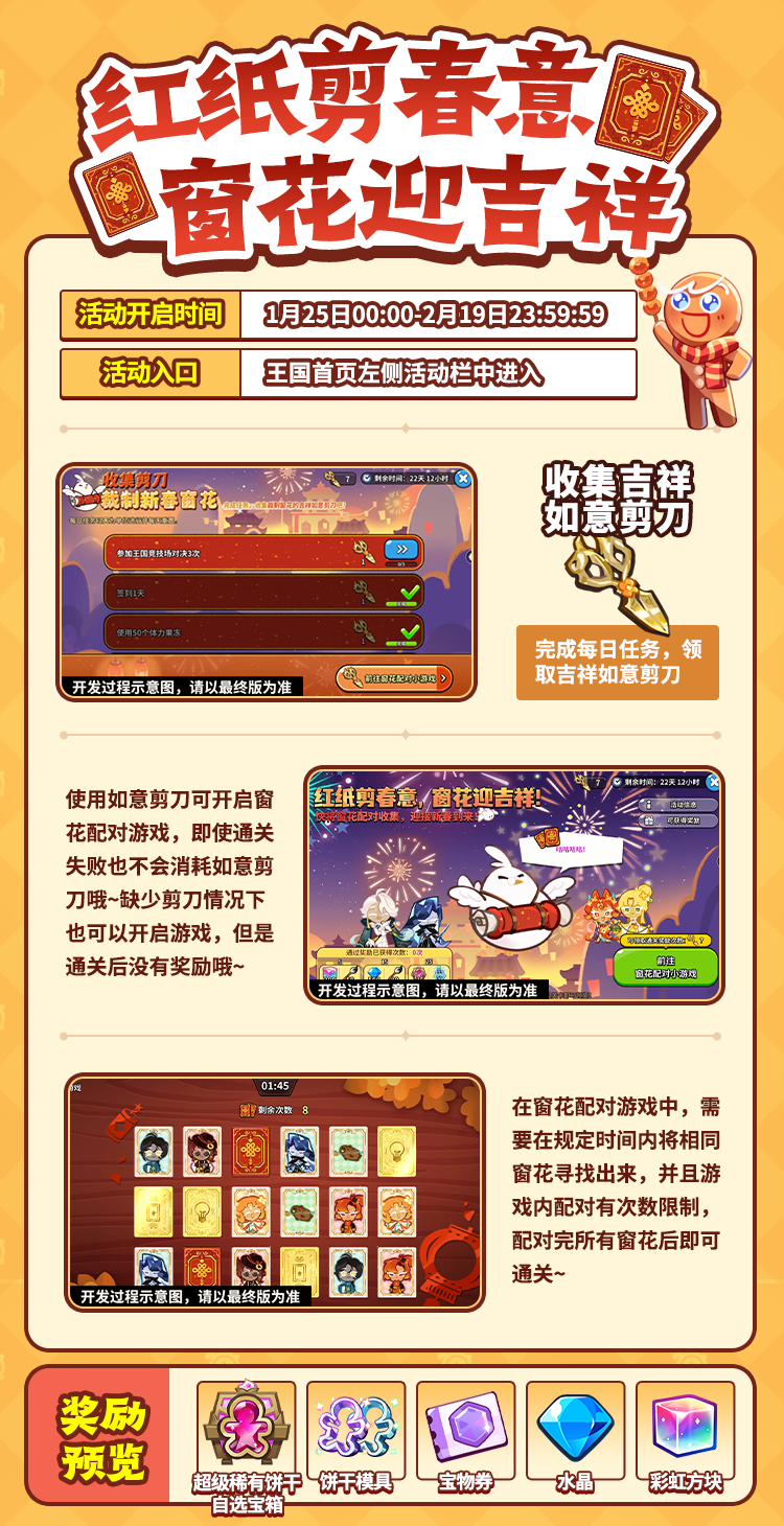 将窗花配对收集,迎接新春的到来,可获得超级稀有饼干自选宝箱、新春游历值、彩虹方块等奖励!