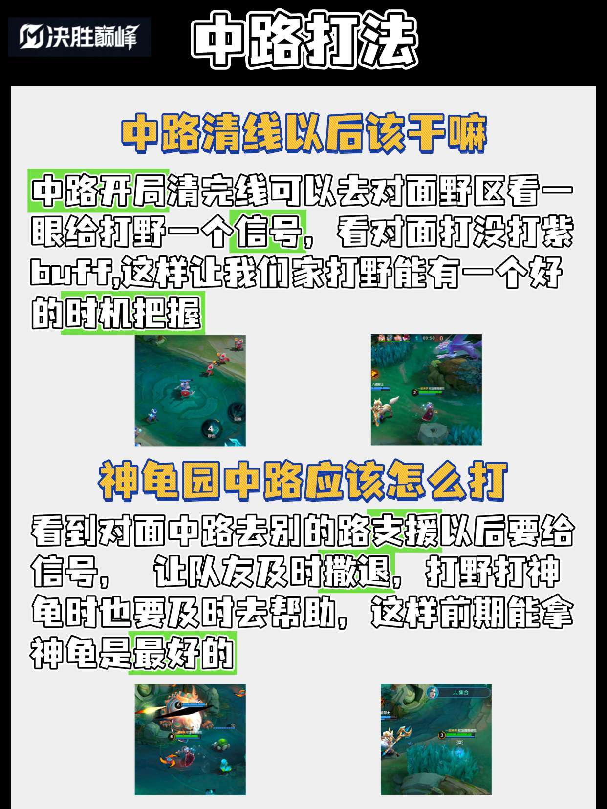 看到对面中路去别的路支援以后要给信号,让队友及时撤退,打野打神龟时也要及时去帮助