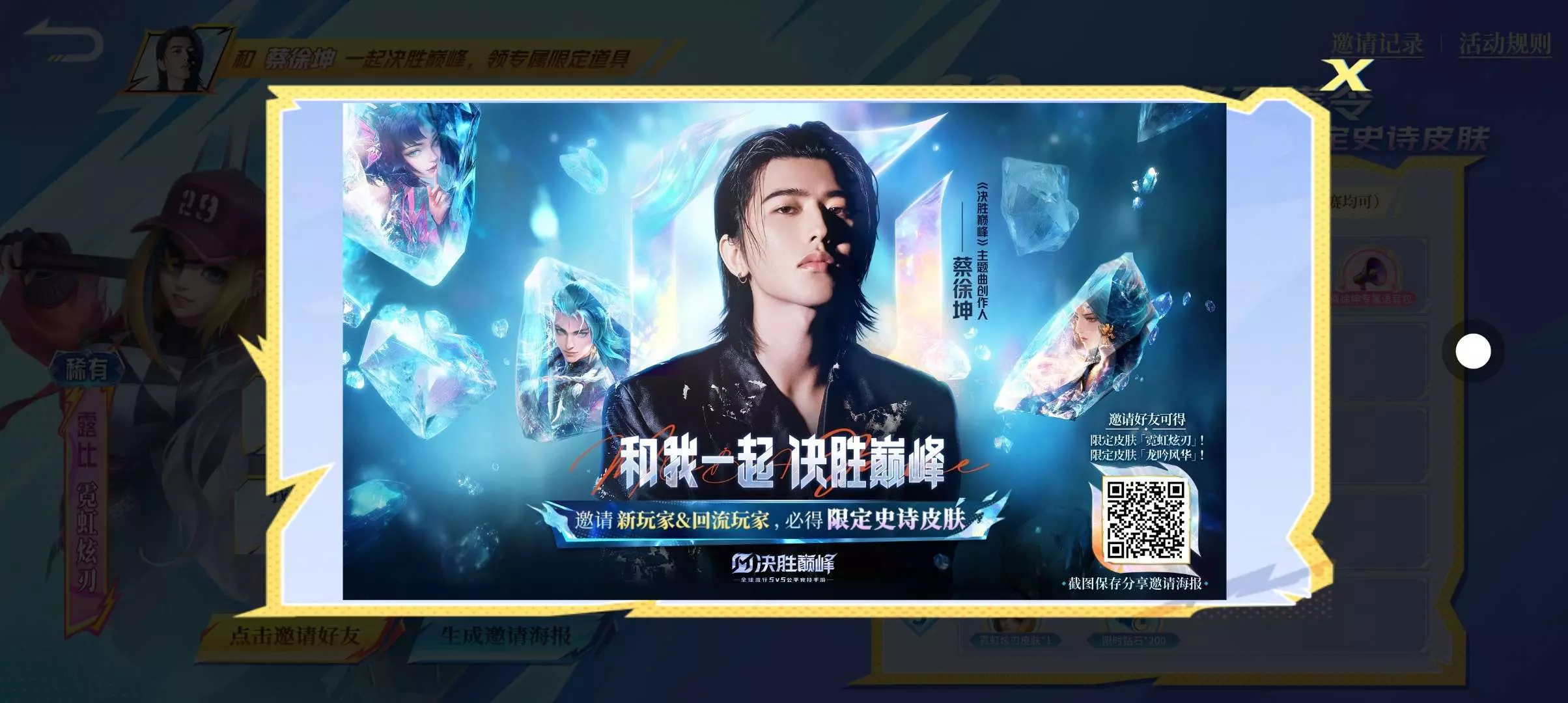 和蔡徐坤一起决胜巅峰,史诗+限定皮肤助力必得。我的助力码 444HXHJE