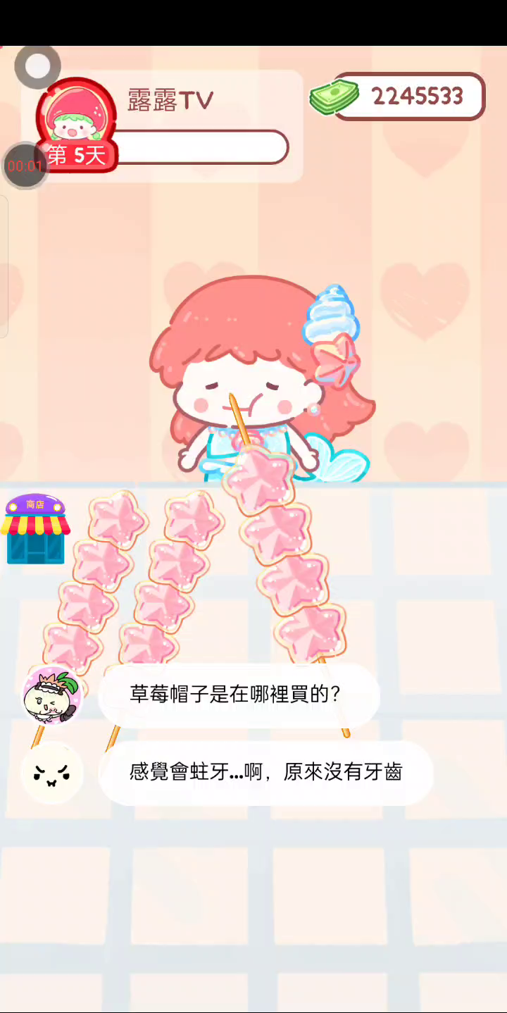 更新新的装饰和圣诞糖葫芦!! 「你进行草莓糖葫芦吃播的话,我就赞助100元。」 「脆口的声音太迷人了(°θ°)」 由于客人都被最近新开的许多糖葫芦店家抢走,曾经号称糖葫芦达人的父母因此卧病在床。 继承父母店面的主角露露开始糖葫芦吃播来宣传店面。 直到成为真正的糖葫芦达人那一天! 「今天我也要开始糖葫芦直播罗!( •o• )」 [串材料] 只有新鲜的水果的话,很难以一名吃播实况主存活下来。还要有松饼、地球软糖、青阳辣椒!利用奇特的材料制作糖葫芦吧。 [裹糖衣] 将材料串满竹签的话,就放进锅子搅动吧。唯有利用达人的秘法,才能裹出又薄又脆的糖衣。 [即时吃播] 咔哒咔哒!今天的吃播也大成功。热烈的聊天内容看起来反应也不错。看来得利用完成观众任务得到的赞助金来买新材料了! 来,准备好了吧?现在就马上挑战成为糖葫芦达人吧!