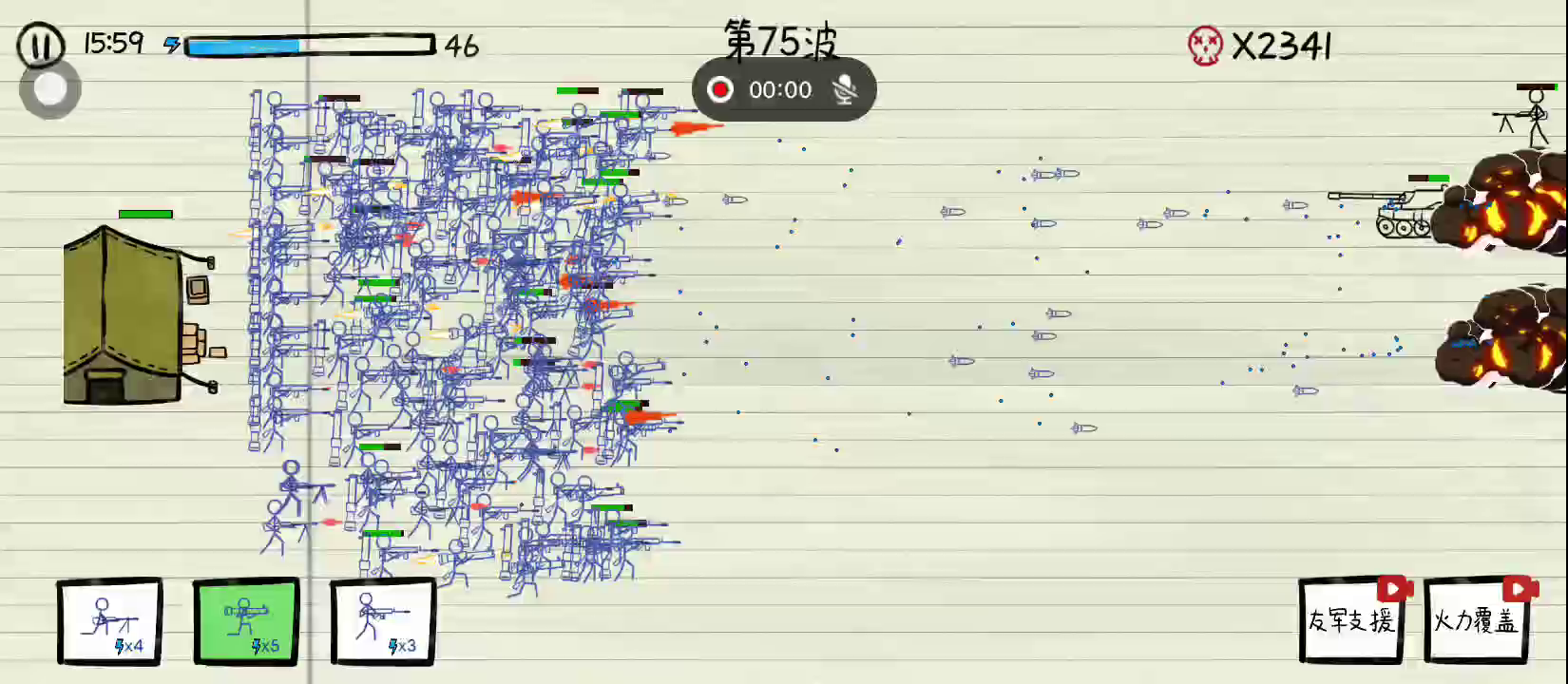 每个人童年的时候,都曾在作业本和课本上作过涂鸦,幻想自己是那一在战场上发号施令,挽救战局的英雄。 现在,纸上战争给了你这么一个机会,继续童年时期的幻想。一群全副武装的火柴人,正在作业本上进行激烈的战斗,而现在,一方需要一个英雄能站出来挽回败局,鼓励士兵们抵挡住敌人们猛烈地进攻,并找准时机主动初级,夺取战斗最终的胜利。 玩法说明: 游戏对局中选择兵种并投入战场,战斗胜利后会获得金币,用来强化士兵。玩家需要保护己方的指挥所不被敌人击破,成功挺过敌人的进攻则取得游戏的成功。 游戏特色: 【多种兵种】 游戏中提供多种兵种供玩家选择,兵种间有不同的攻击方式和彼此间的克制关系。 【强化士兵】 面对敌人越来越猛烈的进攻,我方的士兵逐渐显得力有不逮。指挥官可以选择进入兵营,选择对应兵种将其强化吧。随着不断的强化,我方的实力越来越强,可以从容地面对敌人地攻击。 【火力支援】 如果战局暂时告急,而己方士兵暂时无法感到战场,那么不要犹豫,迅速呼叫总部寻求火力支援吧