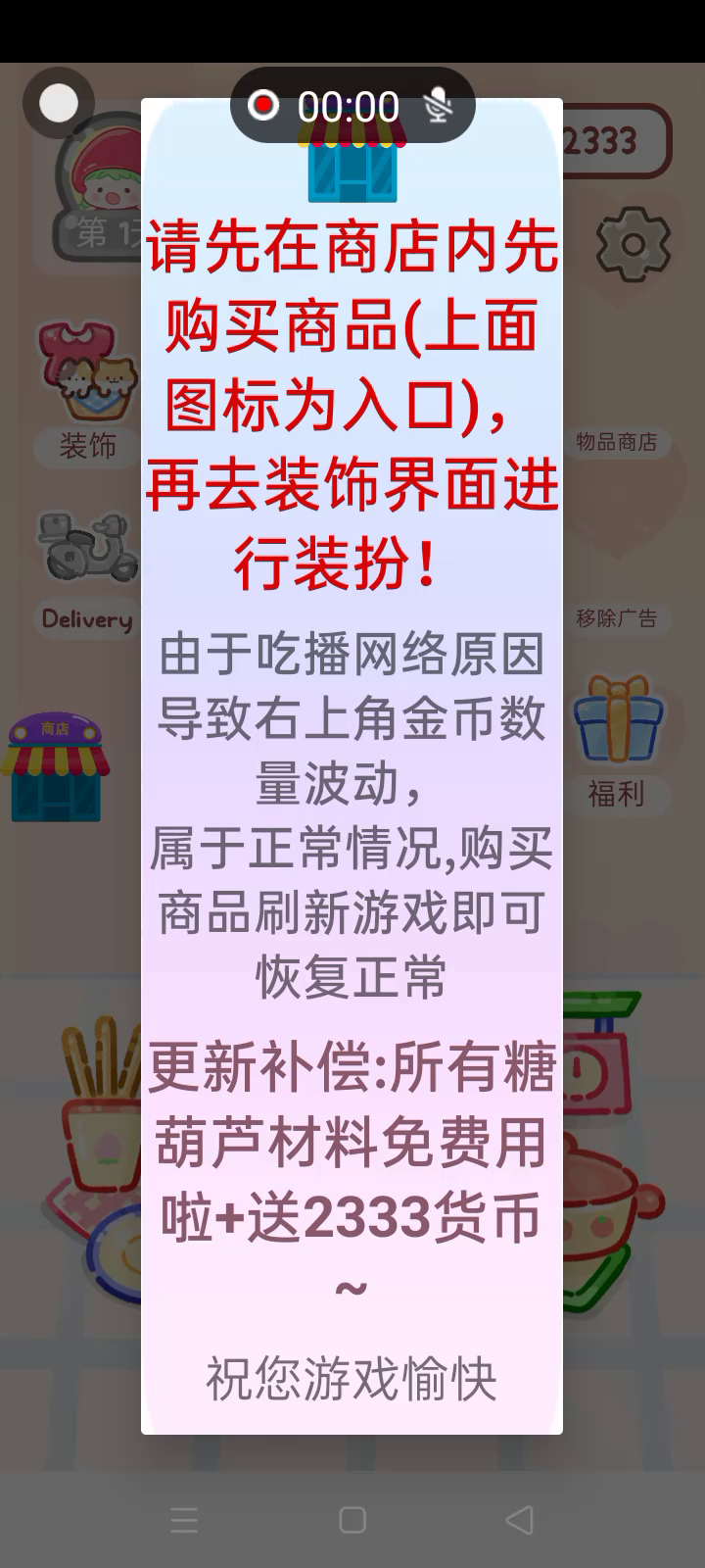 更新新的装饰和圣诞糖葫芦!! 「你进行草莓糖葫芦吃播的话,我就赞助100元。」 「脆口的声音太迷人了(°θ°)」 由于客人都被最近新开的许多糖葫芦店家抢走,曾经号称糖葫芦达人的父母因此卧病在床。 继承父母店面的主角露露开始糖葫芦吃播来宣传店面。 直到成为真正的糖葫芦达人那一天! 「今天我也要开始糖葫芦直播罗!( •o• )」 [串材料] 只有新鲜的水果的话,很难以一名吃播实况主存活下来。还要有松饼、地球软糖、青阳辣椒!利用奇特的材料制作糖葫芦吧。 [裹糖衣] 将材料串满竹签的话,就放进锅子搅动吧。唯有利用达人的秘法,才能裹出又薄又脆的糖衣。 [即时吃播] 咔哒咔哒!今天的吃播也大成功。热烈的聊天内容看起来反应也不错。看来得利用完成观众任务得到的赞助金来买新材料了! 来,准备好了吧?现在就马上挑战成为糖葫芦达人吧!