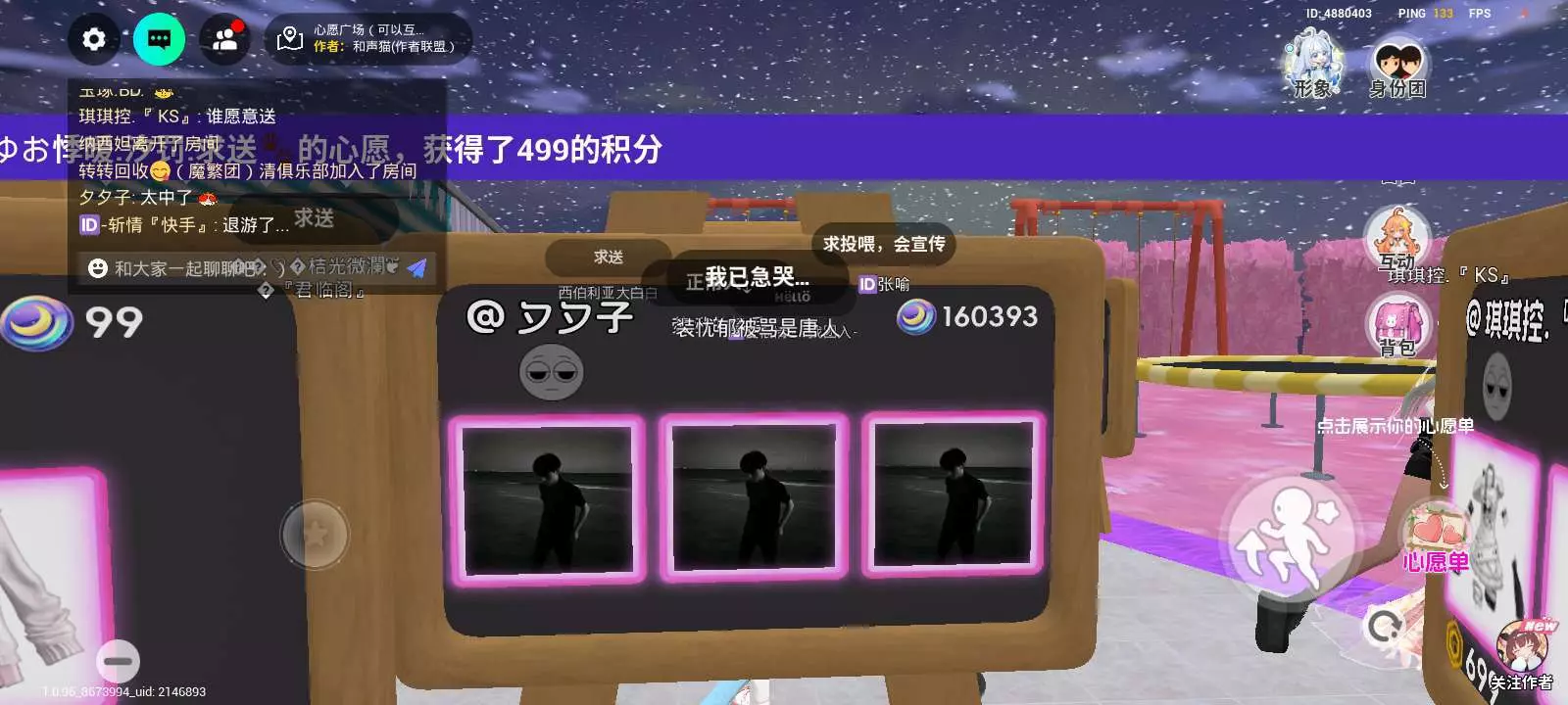 这是一则虚拟社交游戏的帖子,用户在游戏房间内展示内容,还出现了心愿达成获积分、玩家求送心愿物品等互动,展现了该虚拟社交游戏里的趣味社交玩法。