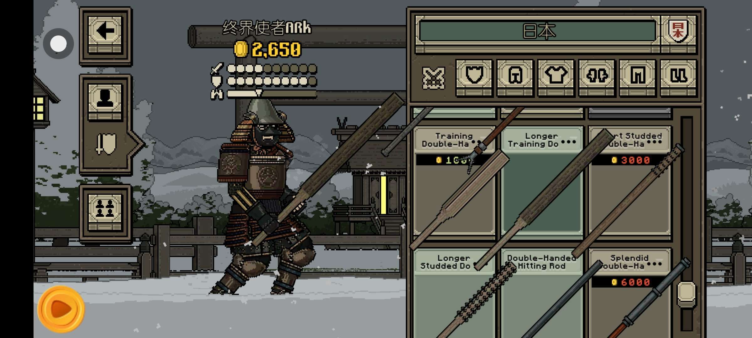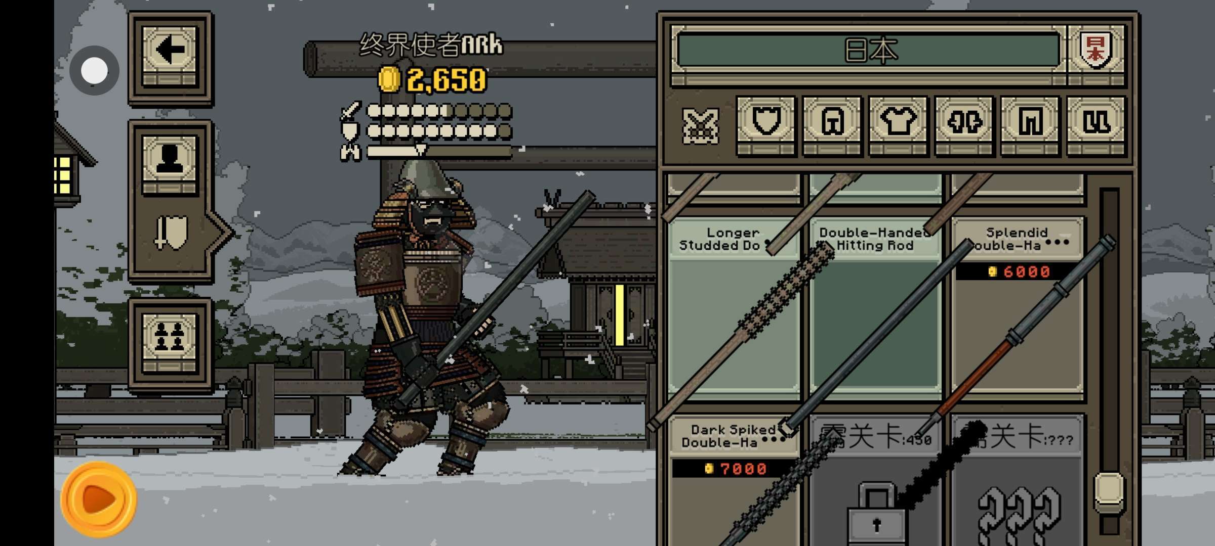 玩日本篇章的萌新们注意啦!我非常建议用这忘了是多少关反正是100关以后的两个棍子,超级轮椅伤害极高,如果是100关之前的建议用双镰刀过度
