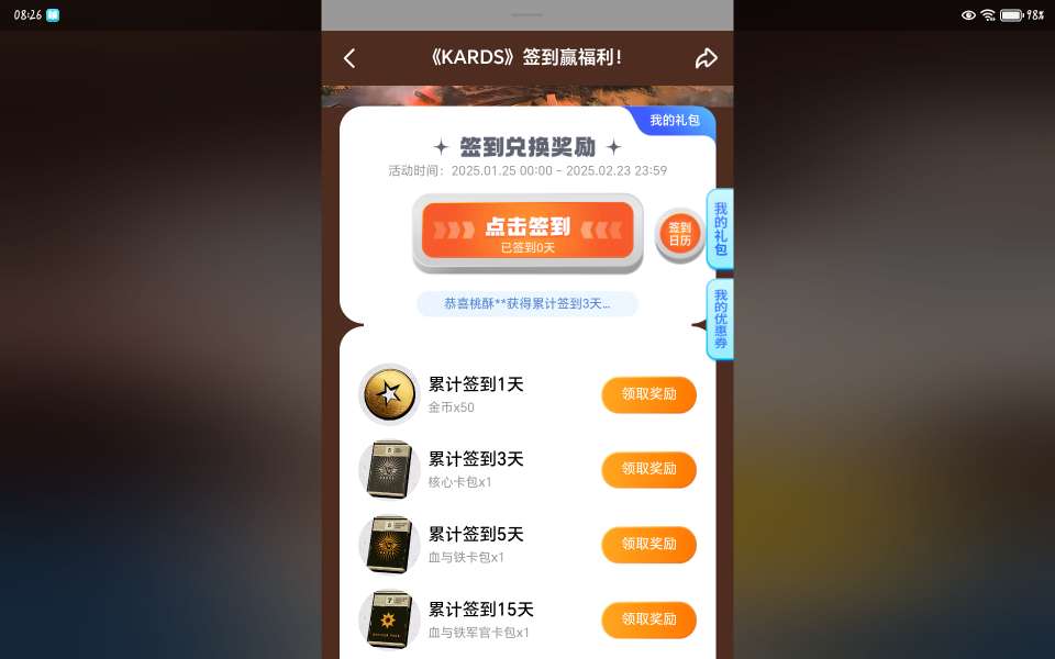 快去签到领奖励,不过我还没下载,但是我看到有这种奖励,就让你们去签到