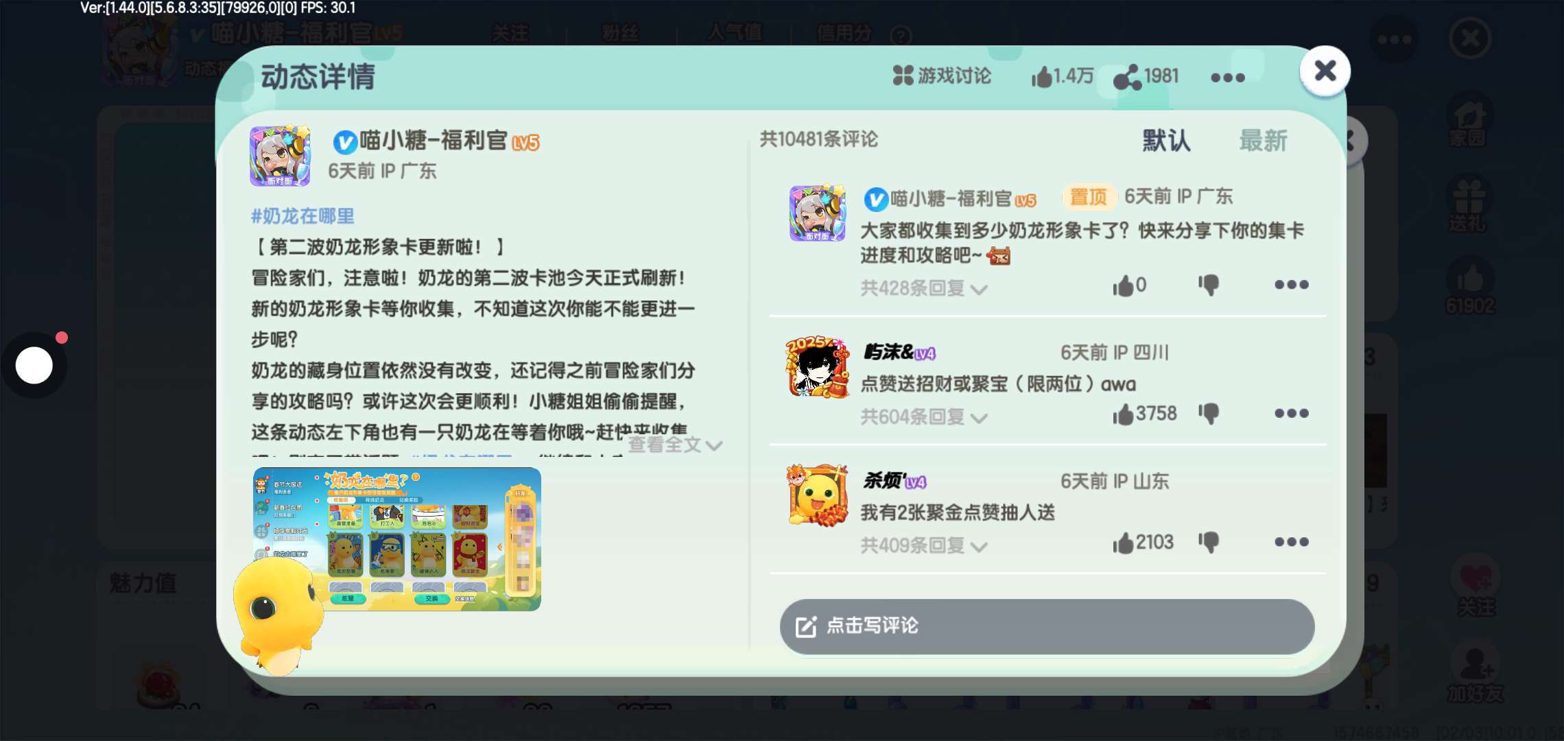 2.喵小糖 ID:1113 的奶龙动态(必须同时符合用户和奶龙动态2个条件!)左下角有3张