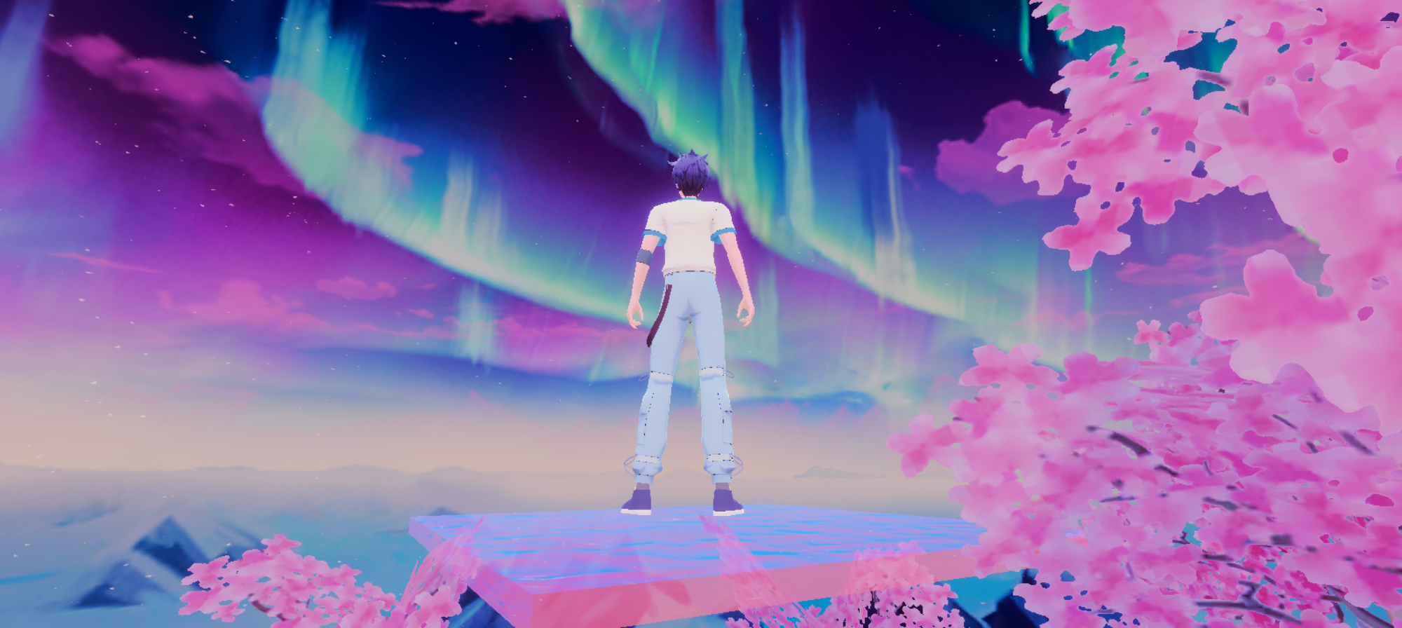 在梦幻极光与烂漫樱花交织的世界里,少年于悬浮平台凝望远方。烟花绽放瞬间,似点亮了心中的绮梦,每帧皆是独属于虚拟天地的浪漫。