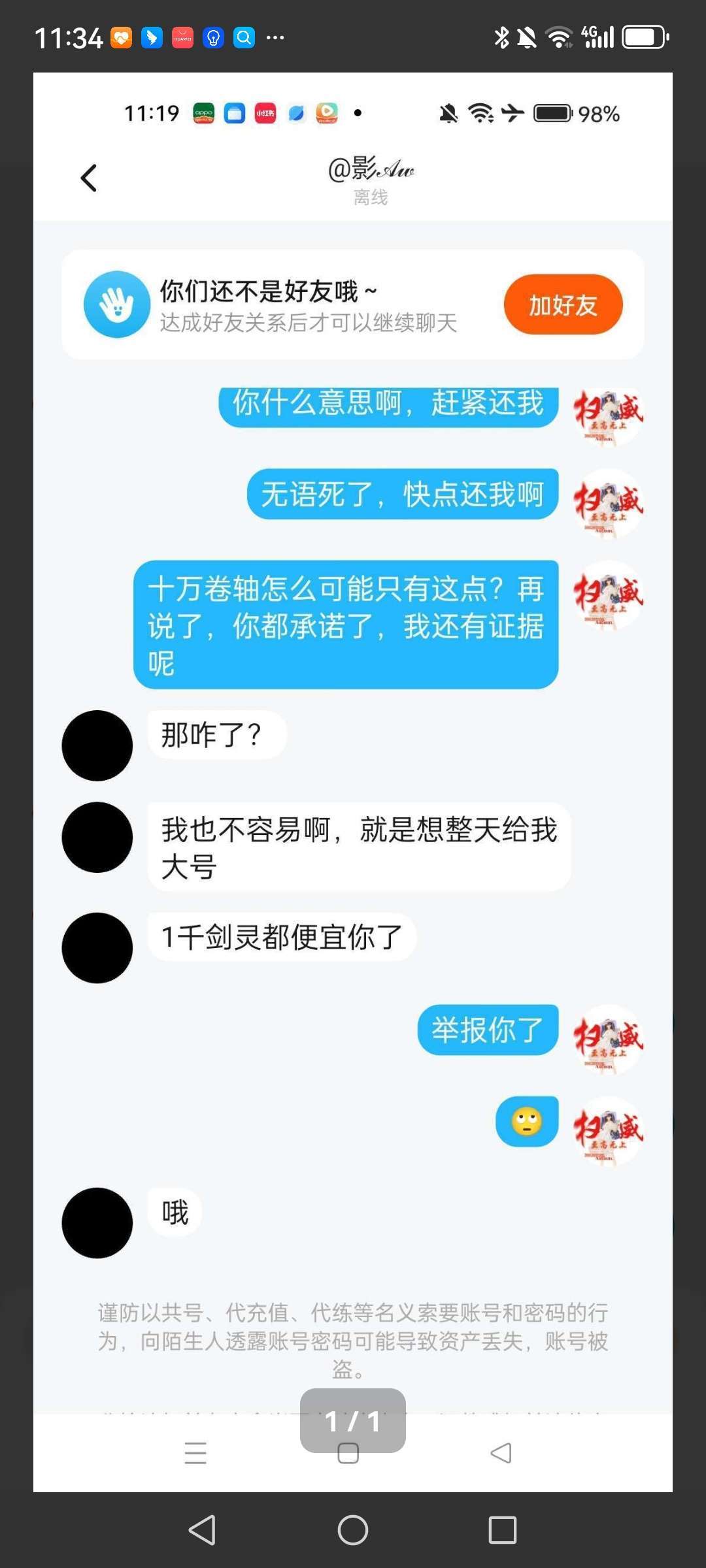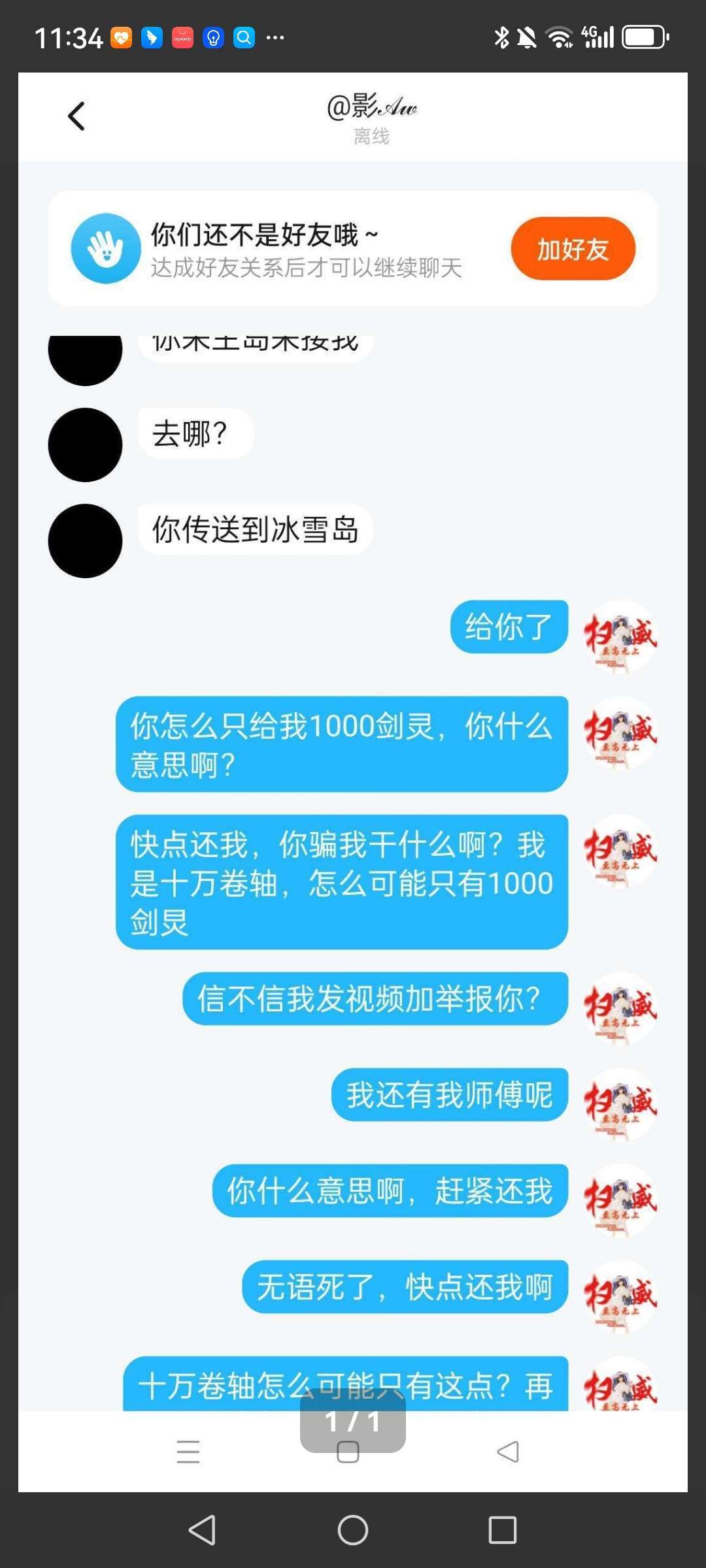 就是上面这个人,昨天找我徒徒换材料,本来说好的我徒徒给他十万卷轴,他给我徒徒十万破军,六万口粮,一万星光,一万剑灵,一万天启剑。结果最后我徒徒给了他十万卷轴,他才给我徒徒1000剑灵