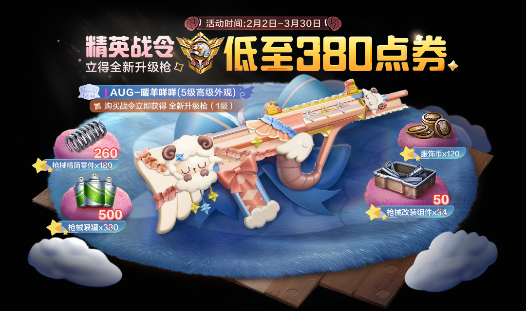 特种兵们解锁精英战令可立即获得全新5级升级枪:AUG-暖羊咩咩 (1级),通过完成每周任务提升战令等级,累计可获得5级枪专属升级材料、服饰币等超值奖励!