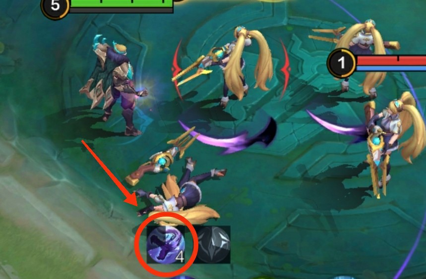 解析:二技能的第二段强化普攻能对敌人造成多层标记,这个标记数是根据第一段攻击到多少个敌人而定,例如下图强化普攻这里“4”,就是我第一段攻击到2个英雄,那么这个普攻就能对敌人造成4层标记。