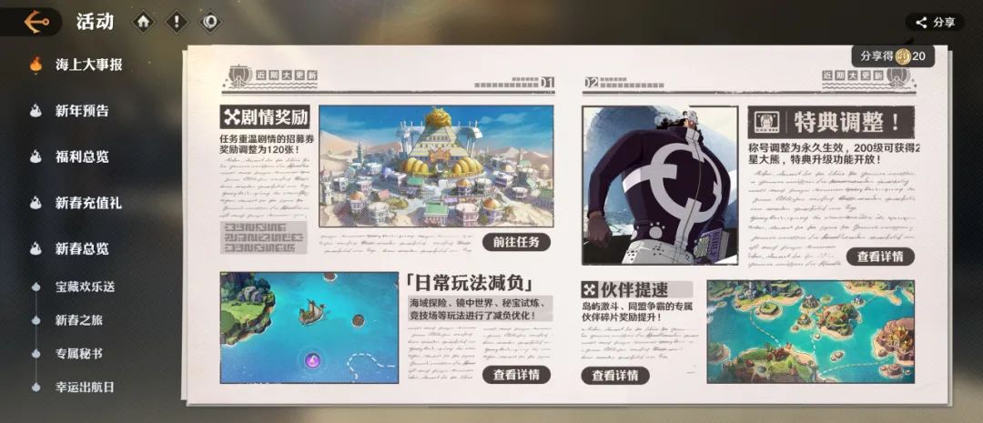 活动内容:船长可于活动界面查看近期重要调整。首次完成分享可以获得分享奖励。