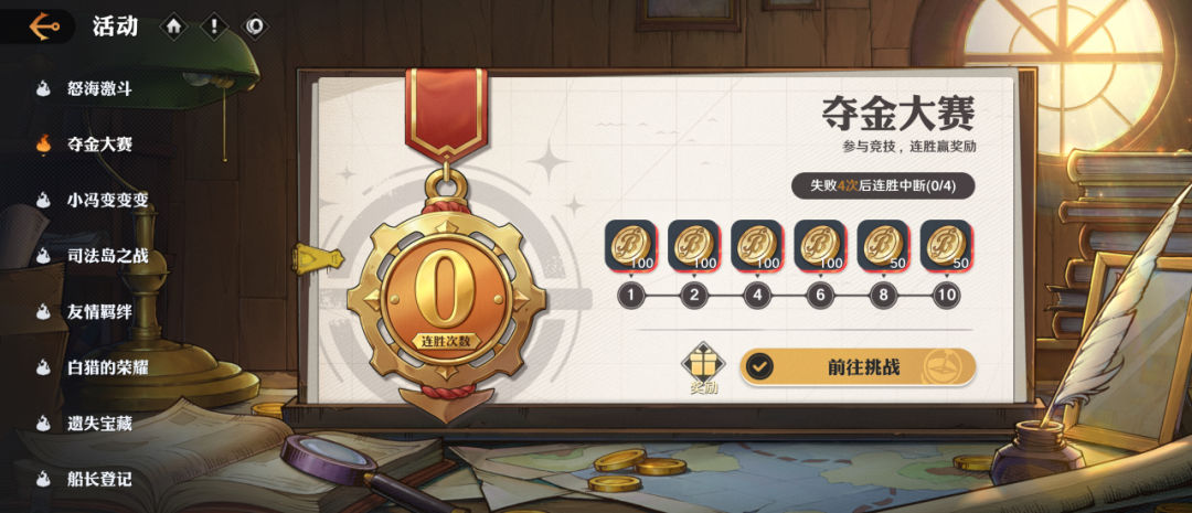 活动内容:挑战巴洛克工作社的特工,过关斩将,展现船长的实力。关卡分为基础关、组合关以及最终BOSS关;通关基础关后解锁组合关,通关组合关后解锁最终挑战关。完成挑战任务即可获得奖励。
