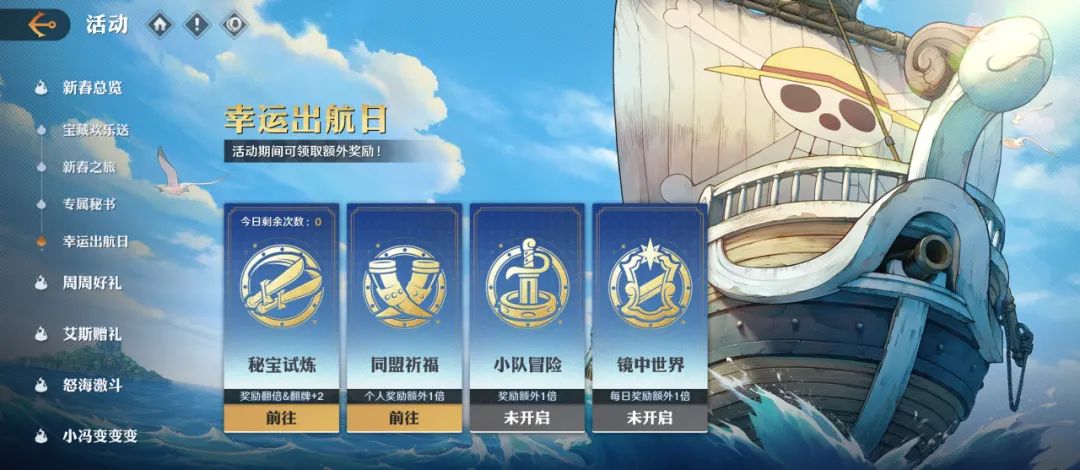 艾斯主题活动,新春:专属秘书,新春:幸运出航日,夺金大赛,司法岛之战,怒海激斗等活动持续进行中。
