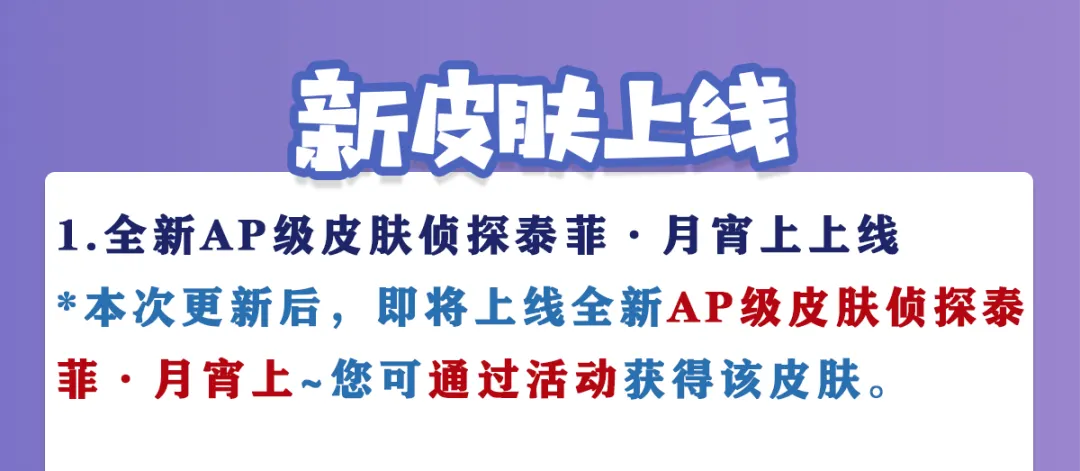 本次更新后,即将上线全新AP级皮肤侦探泰菲·月宵上~您可通过活动获得该皮肤。