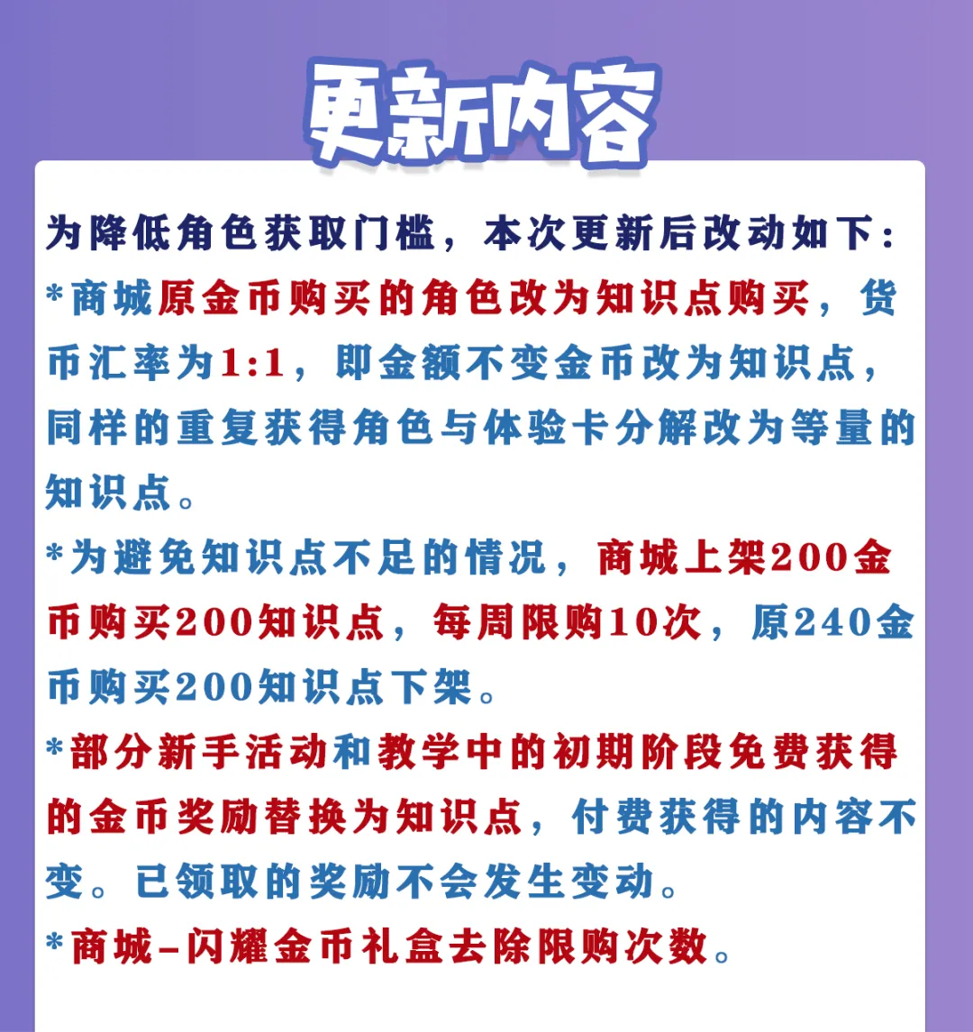 *商城原金币购买的角色改为知识点购买,货币汇率为1:1,即金额不变金币改为知识点,同样的重复获得角色与体验卡分解改为等量的知识点