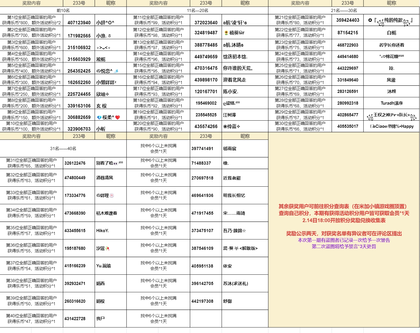 2、第一期开奖后将会顶置积分查询表,大家可前往查看自己的米加活动积分(为腾讯文档)