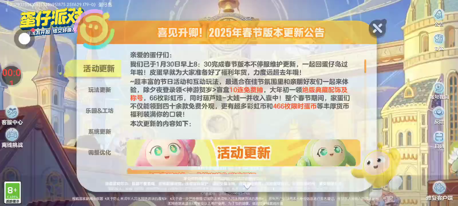 部分玩家反馈在开始游戏界面闪退问题现已修复,请重启233乐园修复内容更新后即可恢复正常,如未恢复可尝试再次重启乐园,感谢蛋仔们的支持与理解。 抖音分享功能部分玩家存在授权失败问题,233乐园已反馈修复中,如有遇到该问题玩家请耐心等待修复通知。 《蛋仔派对》新春版本「蛋闹天宫」开启! 1、春节系列活动开启,逃出惊魂夜模式新追捕者-冥蛇佩姬,新逃生者-报童,新地图-惊魂火车站上线。 2、1月28日更新:葫芦娃、奶龙联动开启,联动活动和联动外观上线,天宫春晚开播,超然玩法新角色蛋小红、小太阳葵葵、游游白柳仙登场。 3、熊出没联动2月2日限时返场! 来历不明的时空虫洞打通过去与未来,世界被迫卷入时间乱流的旋涡中,并随着「21时」的逼近而逐渐陷落。 只有集齐三件时间圣器,才能让失控的时间恢复秩序。危机将至,烛光精灵夜清、执法官布谷、渡鸦阿舍尔跨越时空而来!12月27日,蛋仔派对全新派对季——S21时之回响季正式开启,拯救之旅等你加入。