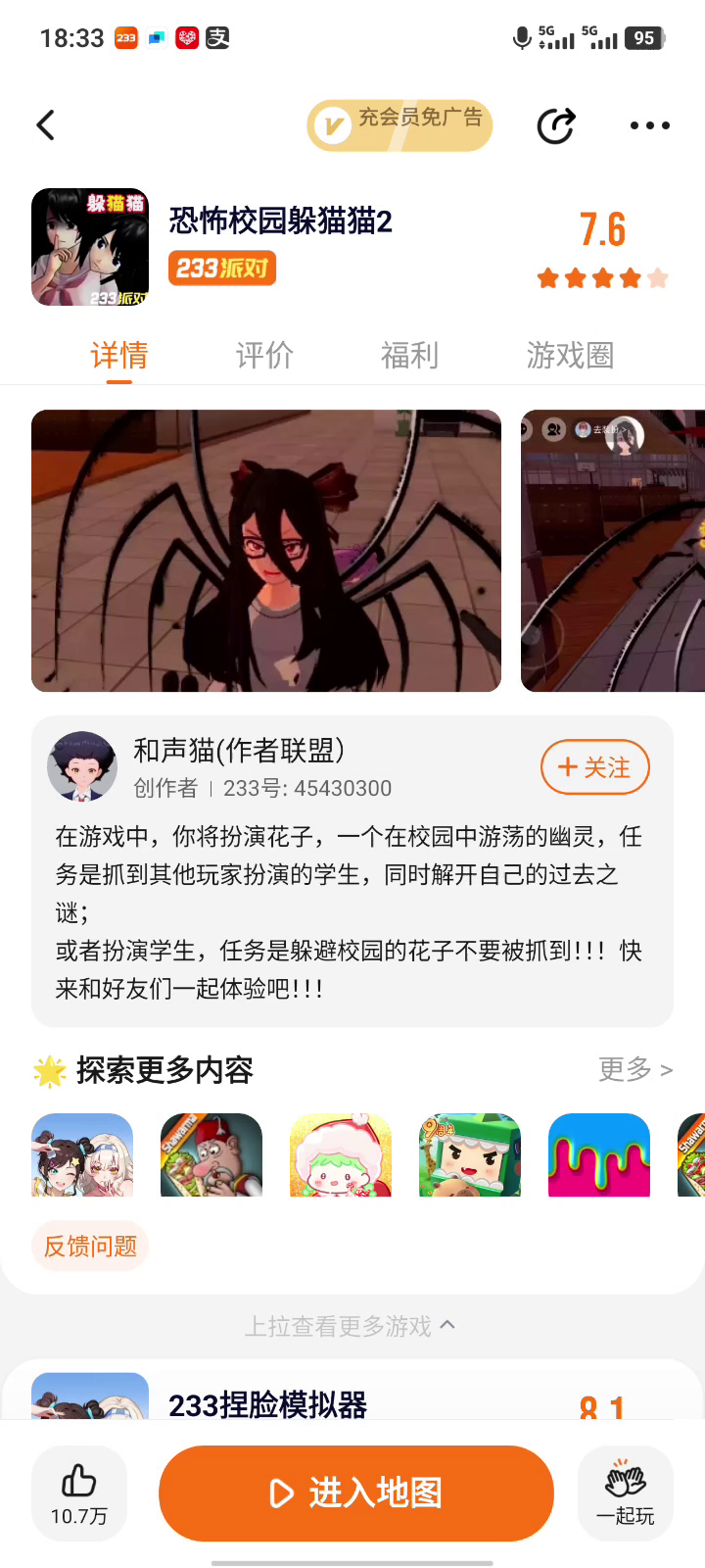 《躲猫猫模拟器》是一款休闲竞技对抗游戏。拥有非对称对抗玩法的同时,加入了实时追逃躲藏玩法。强化了实时互动对抗性。游戏模式也延续一代的躲藏者与抓捕者双模式,让玩家体验两种不同的乐趣。4V1的逃脱者模式,让4个逃脱者联合起来一起对抗boss,寻找宝石打开医院大门逃脱。在游戏中可以体验到实时竞技对抗与敌人斗智斗勇的乐趣,也可以感受到画面音效对恐怖氛围的渲染,让玩家感受全新的心跳体验。多变的策略玩法,丰富的角色道具选择,都让游戏更加经久耐玩令人回味无穷!