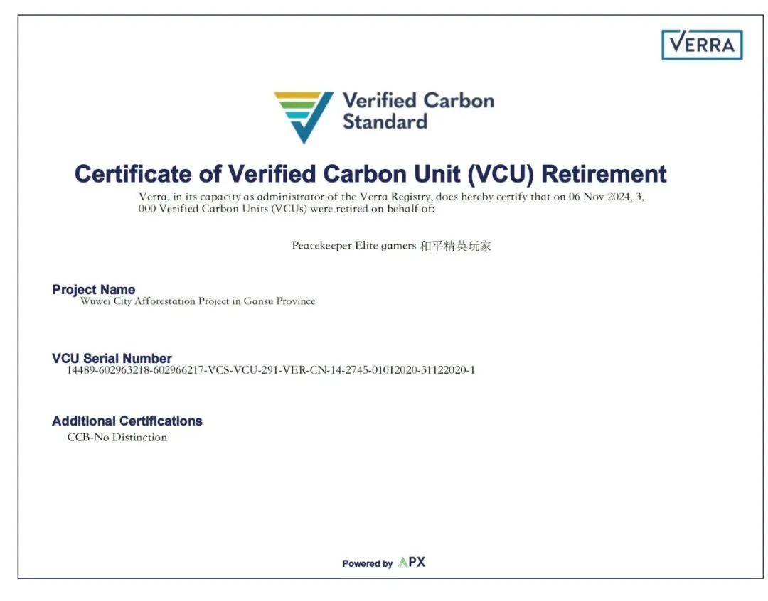同时,和平精英通过SSV碳中和实验室已经完成了在甘肃省武威市3000吨碳汇的购买和核销,支持社会减排,这是一份专属于和平精英玩家的减碳证书。购买碳汇也是对生态环境保护的一种支持,有助于增加森林、草原和湿地的碳吸收能力,从而减缓气候变化的影响。