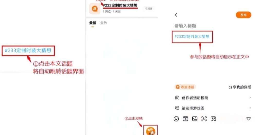 点击活动帖中的话题,将自动跳转到话题界面,点击发帖,参与的话题将自动显示在正文中,编辑你想要分享的内容和作品,点击发布即可参与话题活动