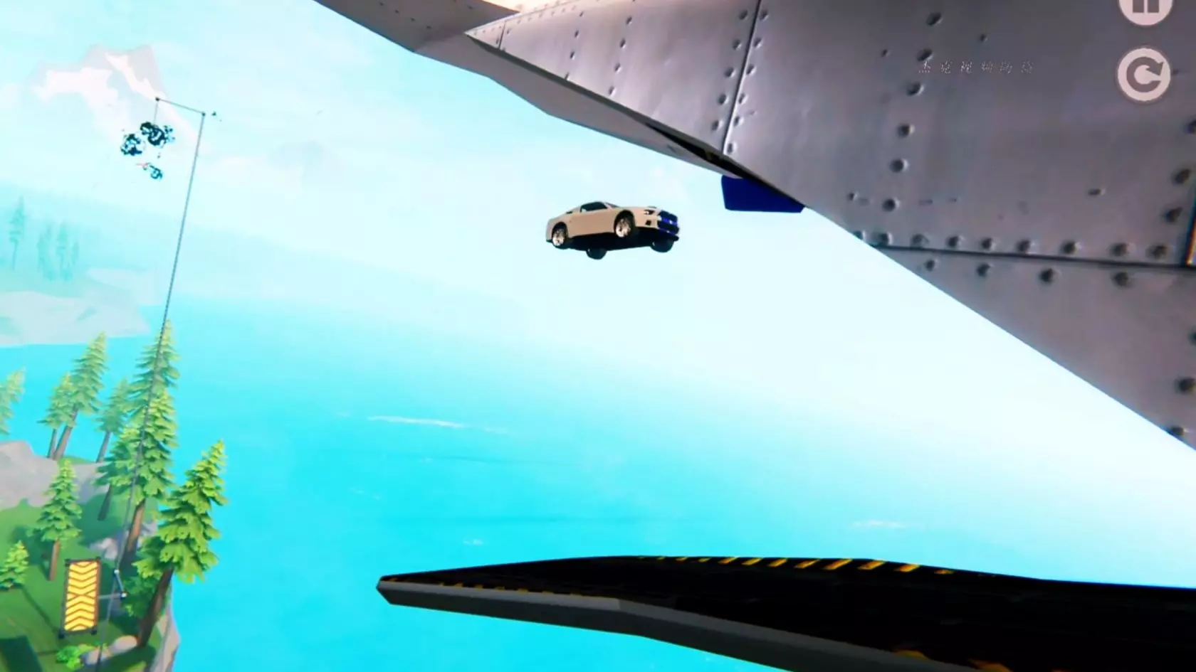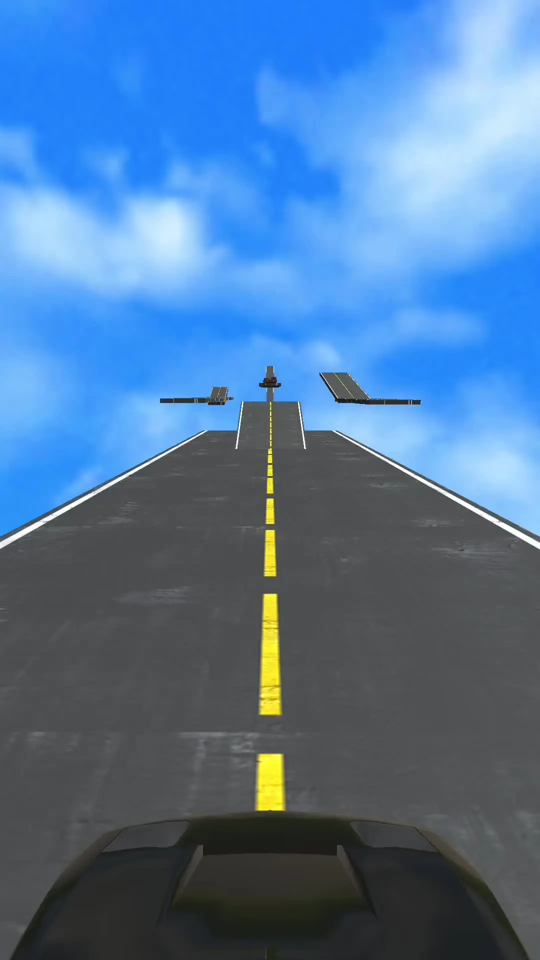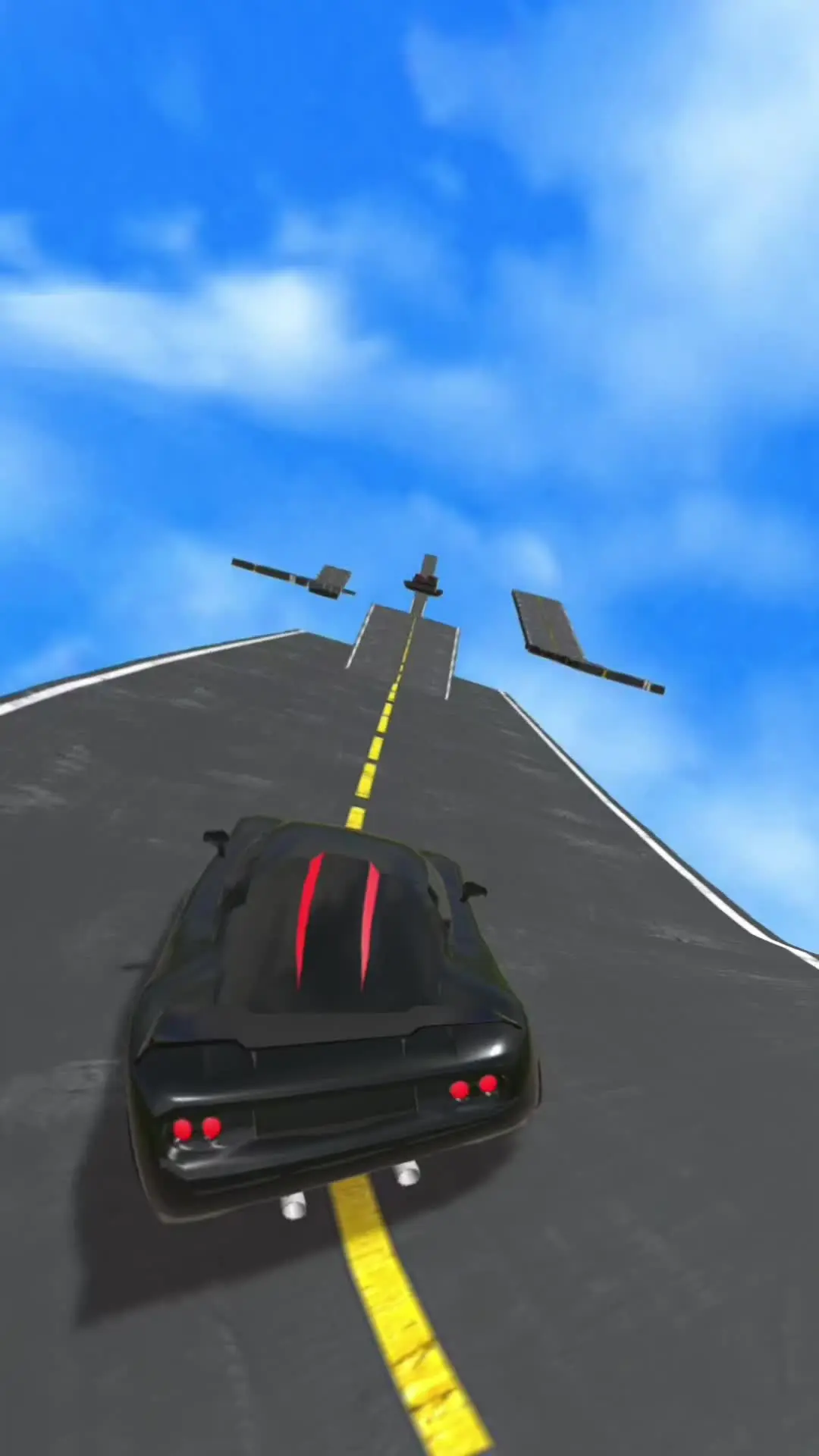 这是一则游戏挑战内容,展示了绿色跑车在高空方块赛道行驶,进行“一个轱辘照样开”的挑战,呈现了特技赛车游戏里的惊险行驶场景。