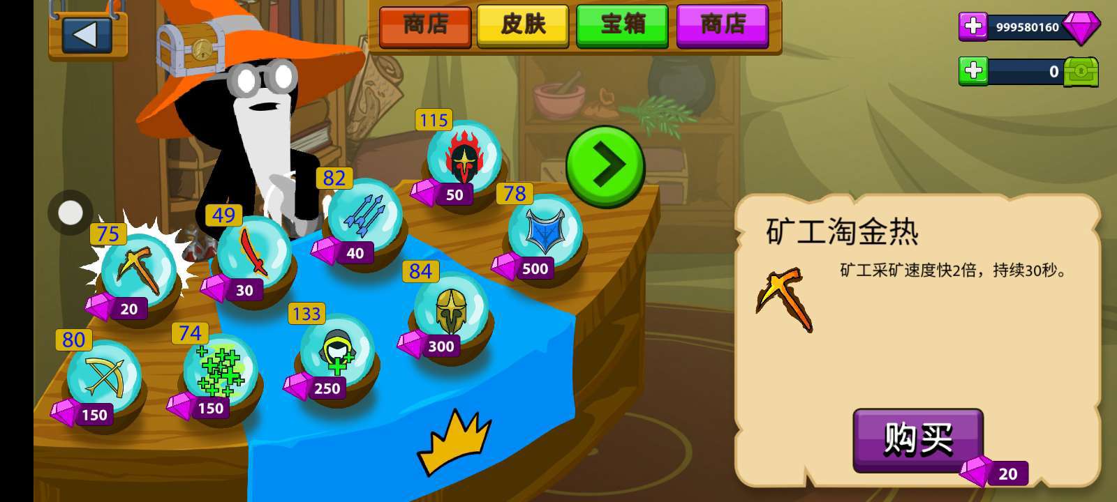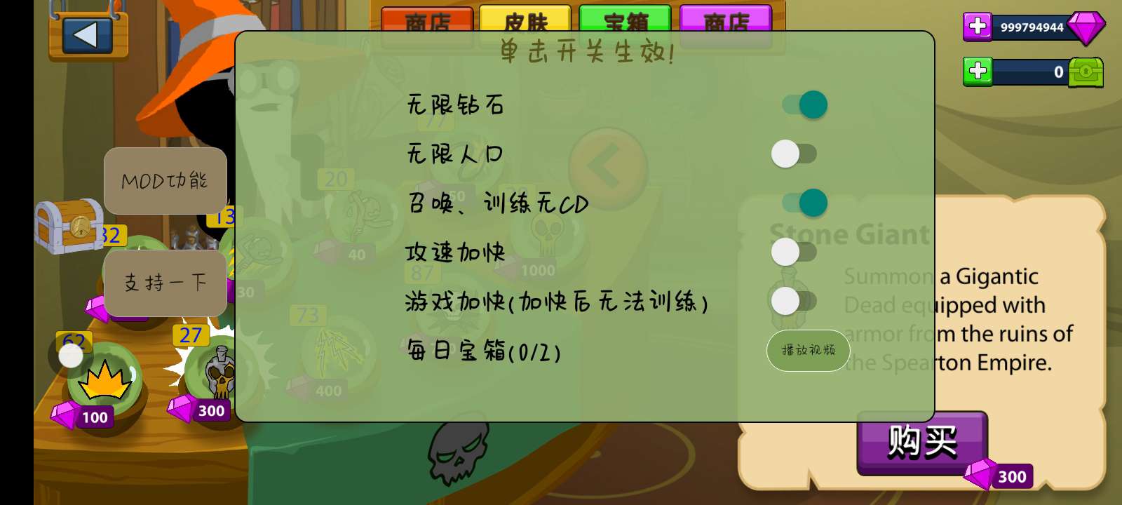 非常不错的一款游戏,只要看一个十几秒的广告。就可以获得无限钻石无cd道具我也买了很多。雕像啊,矿工啊,剑士啊,弓箭手啊,那些皮肤我全买了。体验感十足👍非常推荐!想玩的话就赶紧下载去试试吧。不会获得无限钻石的教程来啦:先点那个宝箱。记住是主页也存在的宝箱哟。然后你想要获得哪个就点一下看广告就可以了