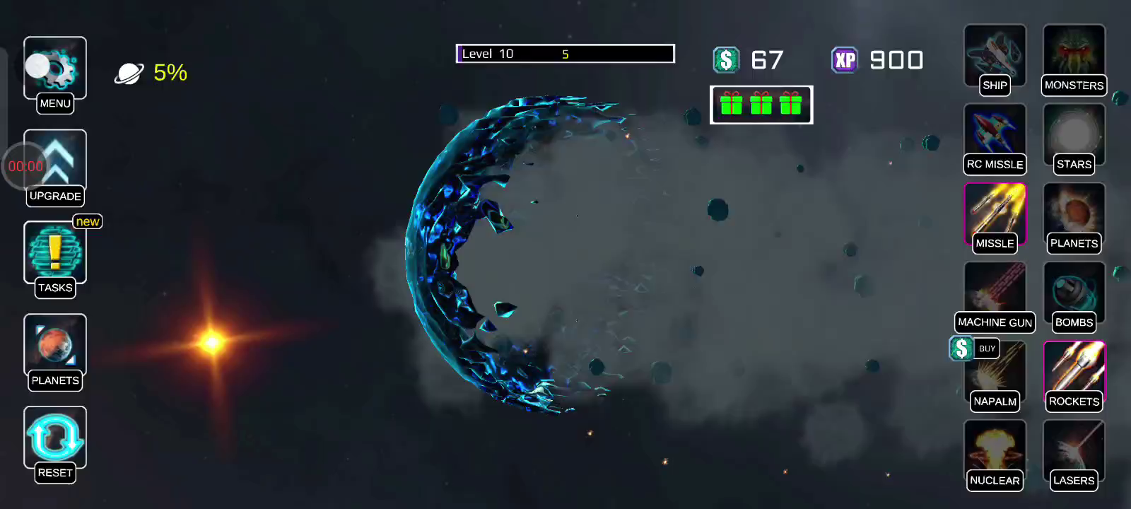 【更新日志】 - 新增2种新武器 - 天神之击、制导导弹 - 新增2个新行星 - 戴森群、拐杖糖 - 年底添加随机礼品盒 - 添加武器名称 - 修复错误 一个星球破坏模拟器,它允许玩家使用各种不同的武器来破坏星球。其中包括核导弹,激光和小行星,甚至黑洞等高科技。