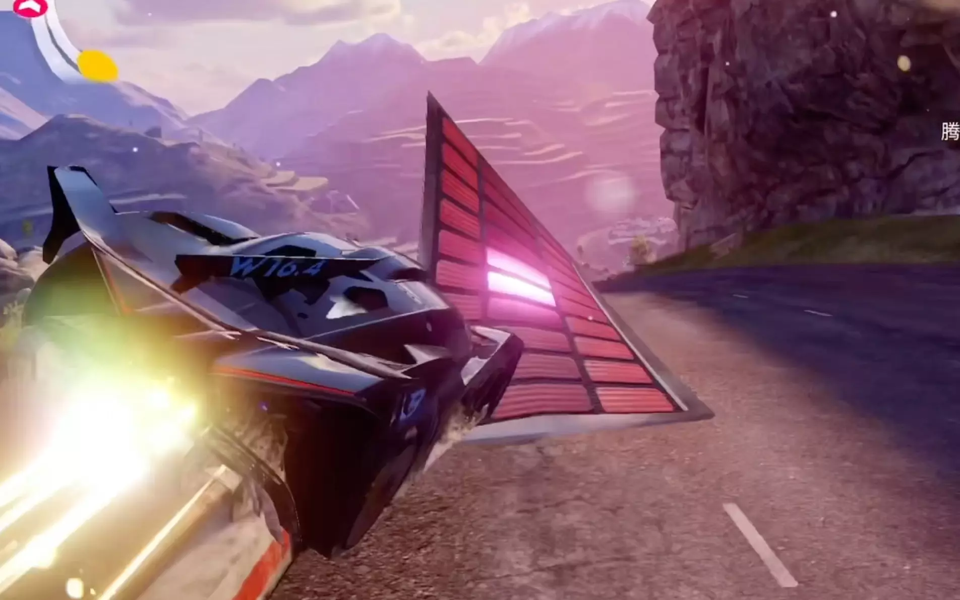 这是一则特技赛车特效挑战内容,展示了赛车在高空特制赛道上飞驰,跨越空中断轨、躲避障碍的惊险过程,特效呈现出极具冲击力的赛车特技场景。