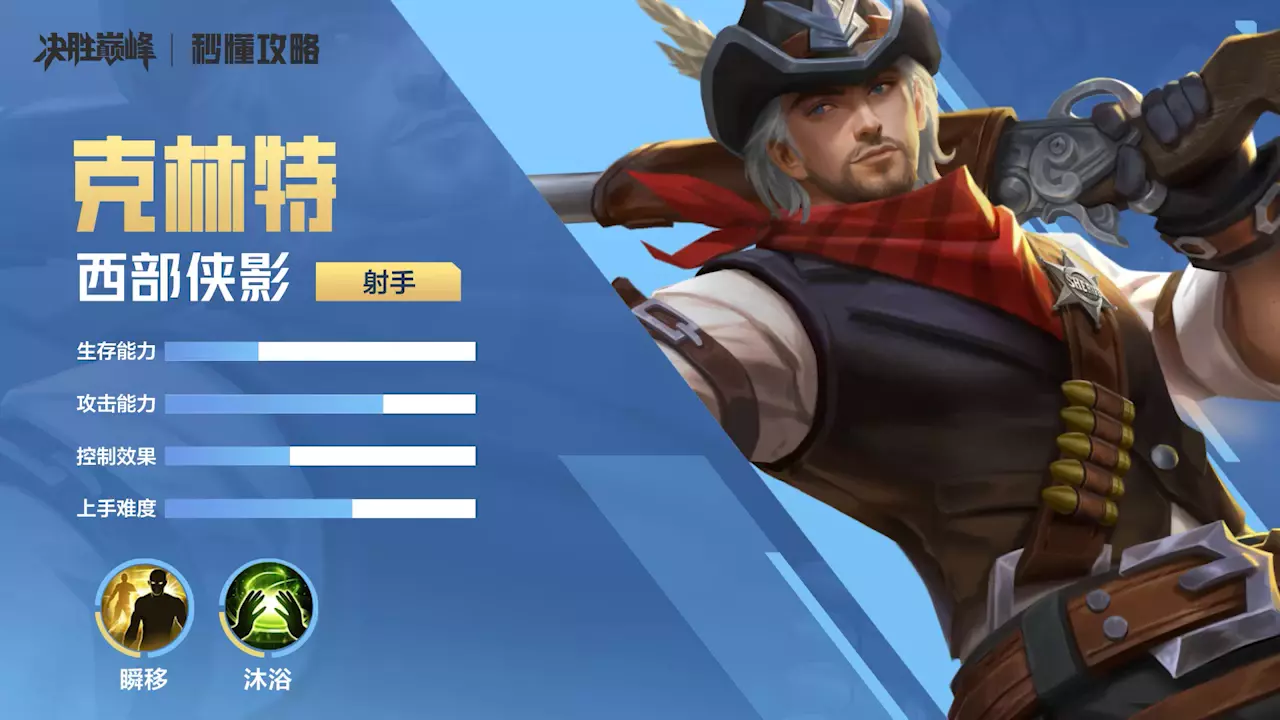 这是一篇《决胜巅峰》射手角色克林特的讲解内容,介绍了克林特的技能机制,比如强化普攻可直线穿透无伤害削减、命中敌人能减二技能冷却,还分享了中期利用射程消耗血量的实战技巧,以及推荐携带瞬移战场技能。