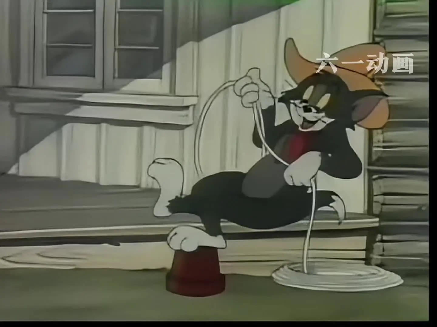 这是经典动画《汤姆和杰瑞》的片段,汤姆拽着绳子以为能抓到杰瑞,实则被杰瑞戏耍,杰瑞在狗狗的狗屋上操控绳子,让汤姆出糗,尽显动画的趣味搞笑。