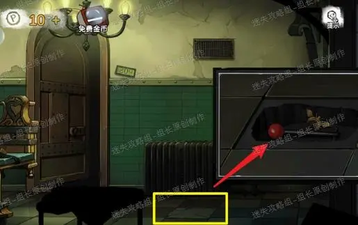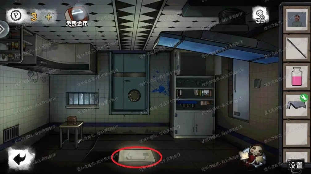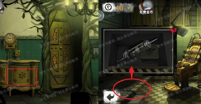 10、 前往走廊,红框处放入木块打开后得到【把手】,然后回到实验室里,红圈处地毯点击后移动开,下面的门点击放大后依照顺序使用以下道具:把手、螺丝、十字螺丝刀。之后就能打开,得到里面的【巨型针筒】,边上盒子先不急。