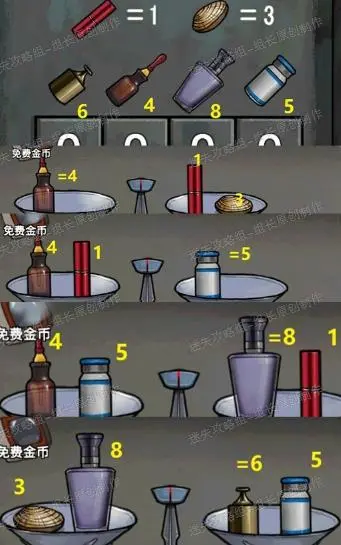 42、 木屋白色保险箱密码来自于颠倒药剂室的天秤游戏,详细解法如下图,最终得出各个物件对应重量后密码可知:6485,前往木屋桌上的白色箱子里得到【容量瓶】,同时木屋背后的壁画是镇静剂提示之一,记下。