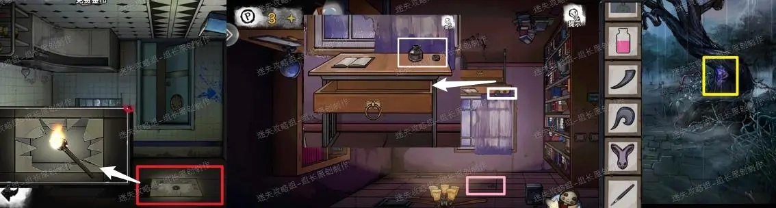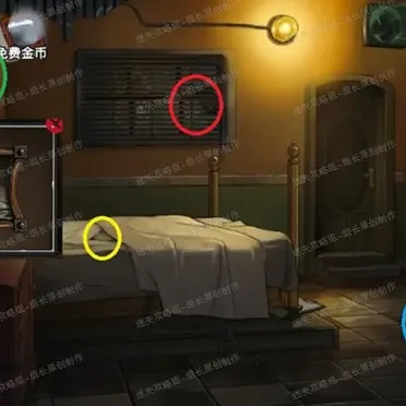2、 房间场景,红圈处得到线索-【画碎片】-1,黄圈处得到线索-【画碎片】-2,之后两个画碎片对绿圈使用完成拼图后可以看到【红色数字3257】,这个密码用到蓝圈处的箱子打开之后得到【旋转阀门】,旋转阀门使用到紫圈处后点击就可以开门前往下个场景。