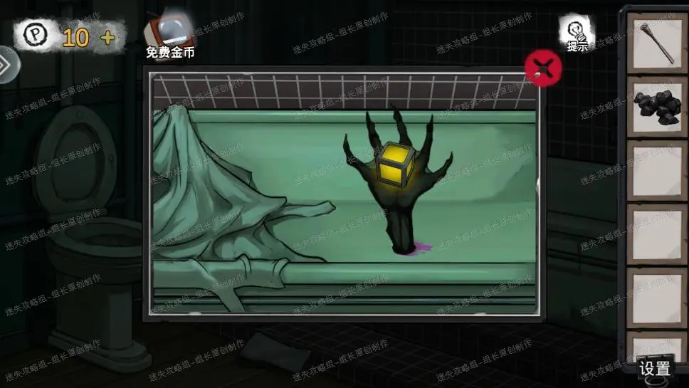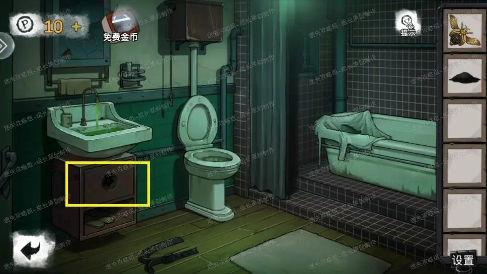 14、 前往卫生间,点击浴缸放大后对放水孔使用紫红色液体,下面会伸出一只手,点击手获得手里的【能量块】。
