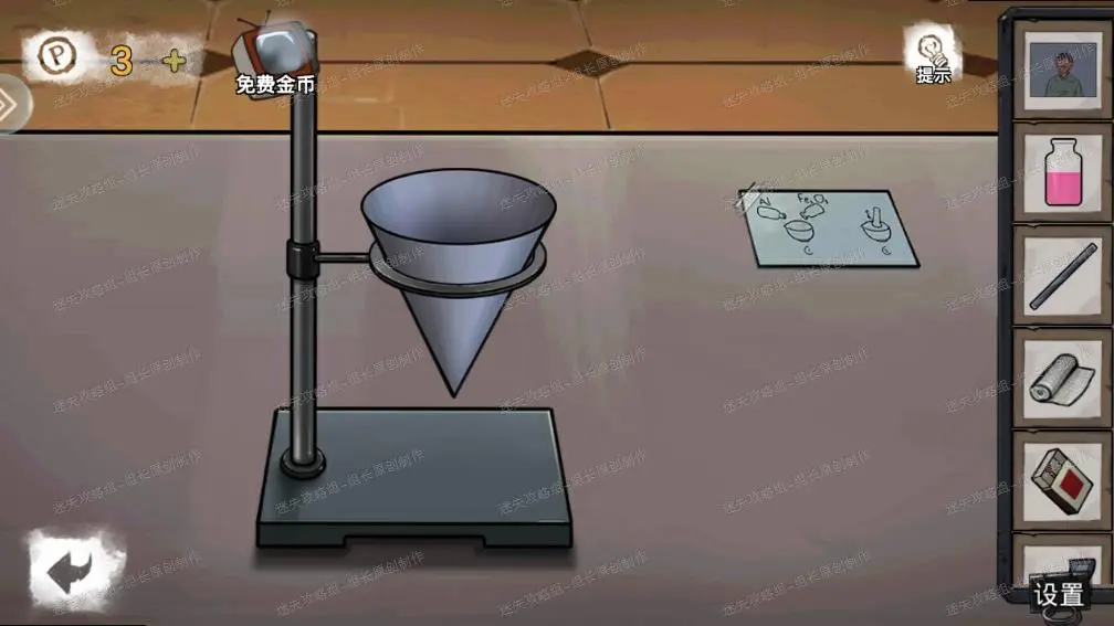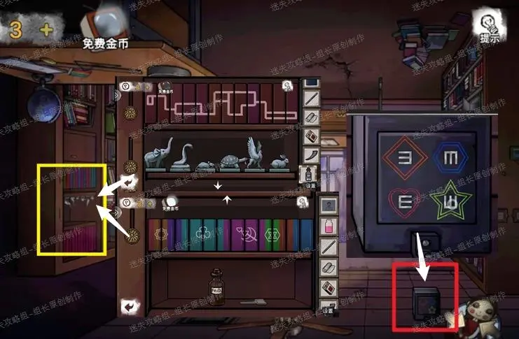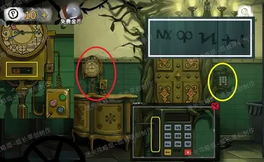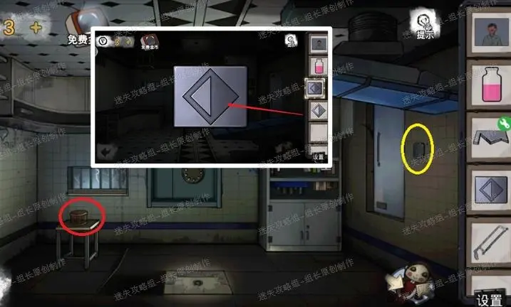 23、 实验室,下图红圈处放入圆块,之后进入小游戏:这是个寻物小游戏,三个数字的意思就是找到跟左边相同的图形进行点击,全部0之后就能打开,得到【金属碎块】-1,同时触发剧情,实验室地上蓝框处能得到一个【布偶】,布偶点击放大后拖动舌头,就可以得到新能力:颠倒房间。