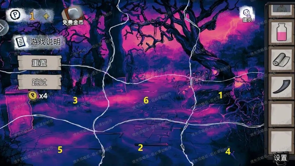 28、 颠倒药剂室,黄框处得到【镁条】,同时小游戏的答案如图中所示,完成后黄圈会打开,得到里面的【石块】-1。红框处得到【纱布】、【火柴】。