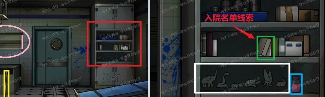 21、 实验室中,黄框处的【铁棍】先拿上,铁棍直接对粉框处使用,撬起来后得到下面的【鬼脸】-1,之后粉圈这里的百叶窗点击放大后用右边的绳子(比较细,注意点击后往下拉,不是单纯点击)得到窗台上的【鬼脸】-2。红框处点击放大后首先白框是图书馆里的密码锁要用,记住,同时边上蓝框处的红色液体【广口瓶】拿上,上面中间层绿框处拿开书后得到【【入院名单】】-线索。