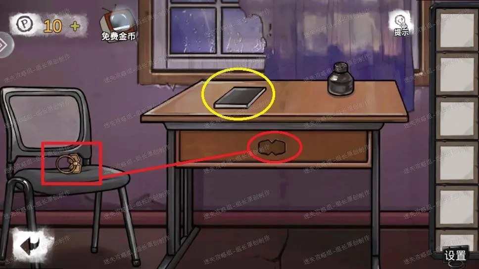 19、 书房内首先窗前的书桌下点击放大后红框处得到【拉环】,直接对红圈处使用得到拨片。黄圈处点击后打开看到镇静剂制作说明书,书右边的【纸片】拿上,后面会用。