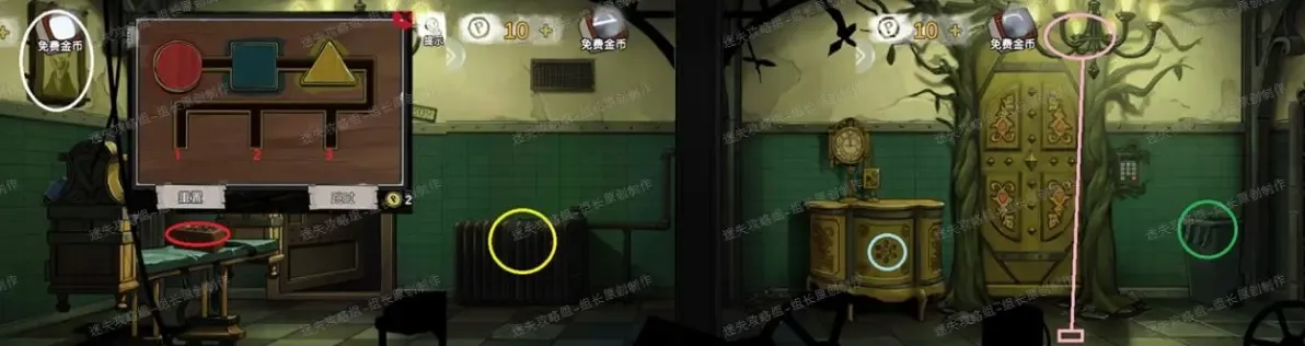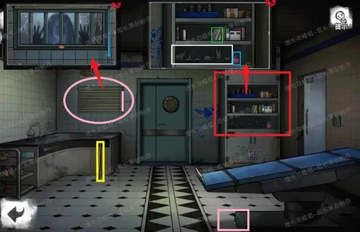 3、 走廊场景白圈获得对话剧情。红圈完成游戏后得到【螺丝刀柄】,黄圈点击放大后可以看到一个【按钮】拿到,之后绿圈的垃圾桶内可以得到两样物品(连续点击直到见底):【木板】【纸片】。只有在拿到垃圾桶的木板之后粉圈上的东西才能拿到,点击放大后点击上面的一个六边形形状,会掉落一把钥匙在粉框处,得到【钥匙】。之后先去{病房}。