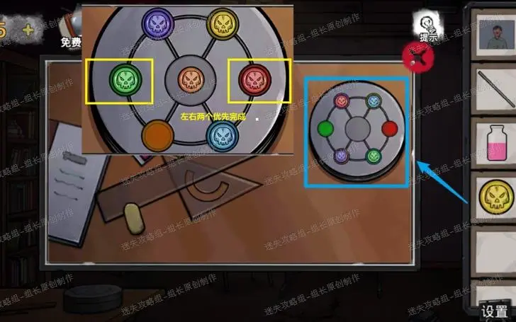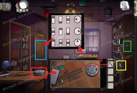 20、 下图红框处点击放大后桌上得到【发卡】。黄框处点击放大后使用发卡打开得到【拨片】,绿框处点击放大后将第一章照片往上拉得到后面的【【照片】】-这是线索。蓝框处点击放大后放入两个拨片(长得不一样但是都是拨片)。依照之前窗前桌子上书里的纸条给出的提示,完成这个小游戏后三个灯会全部点亮(圆圈里代表指向的灯,左边代表对应这个灯的拨片位置)完成后开门进入实验室。