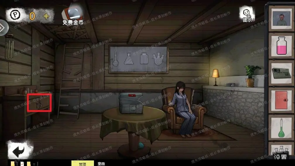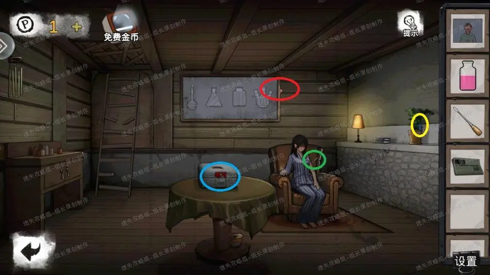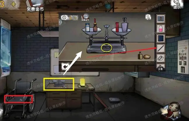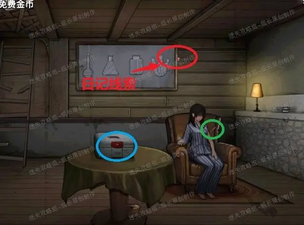 41、 木屋内,首先红圈处得到【【日记本】】-线索。黄圈处得到解冻剂。绿圈处点击后得到剧情,点击针筒后得知需要镇静剂。蓝圈处的密码就是颠倒药剂室的天秤需要进行的解谜,下面进行详细说明。