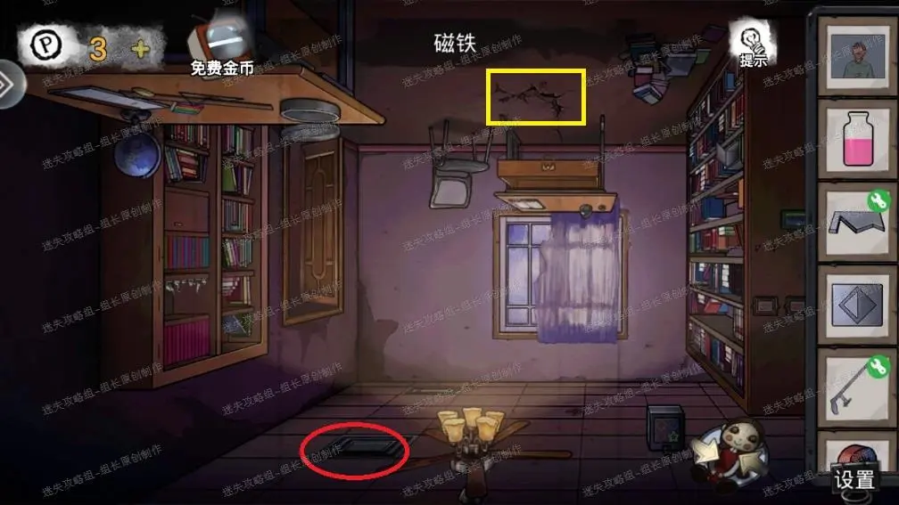 24、 使用娃娃颠倒房间后,在颠倒的实验室里,红圈处点击放大后使用铁棍,打碎得到【铁盒】和【缺少锯条的锯弓】。